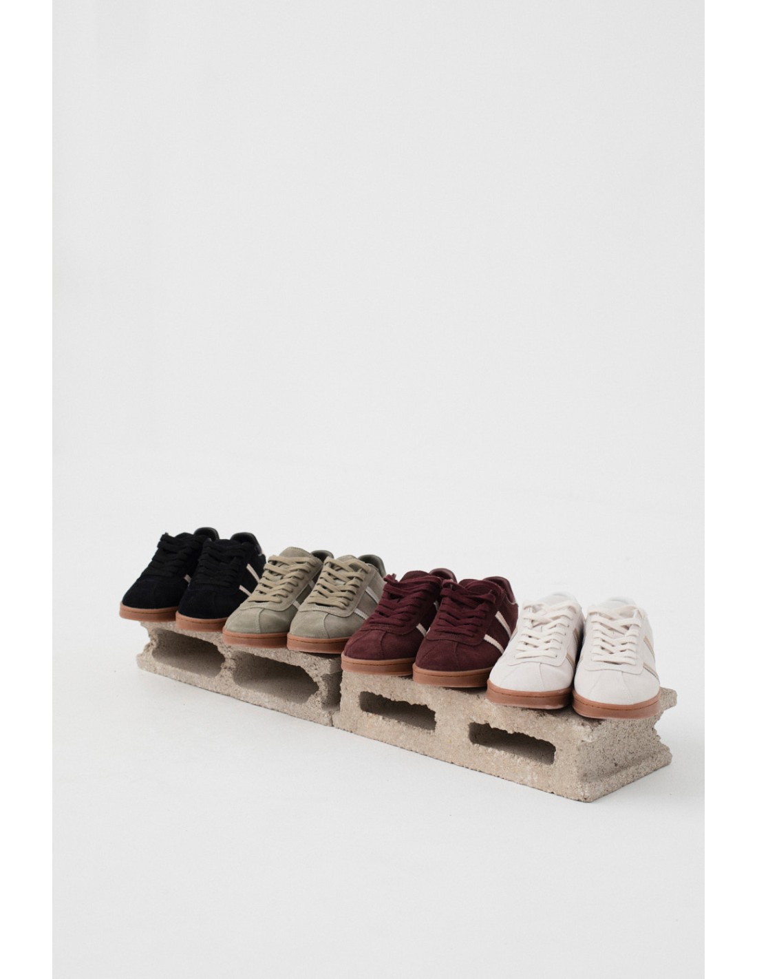 Zapatillas de cuero dividido con dos bandas laterales en color de contraste. Suela de goma y cordones planos tono sobre tono. También tiene el logo en el talón y la plantilla.