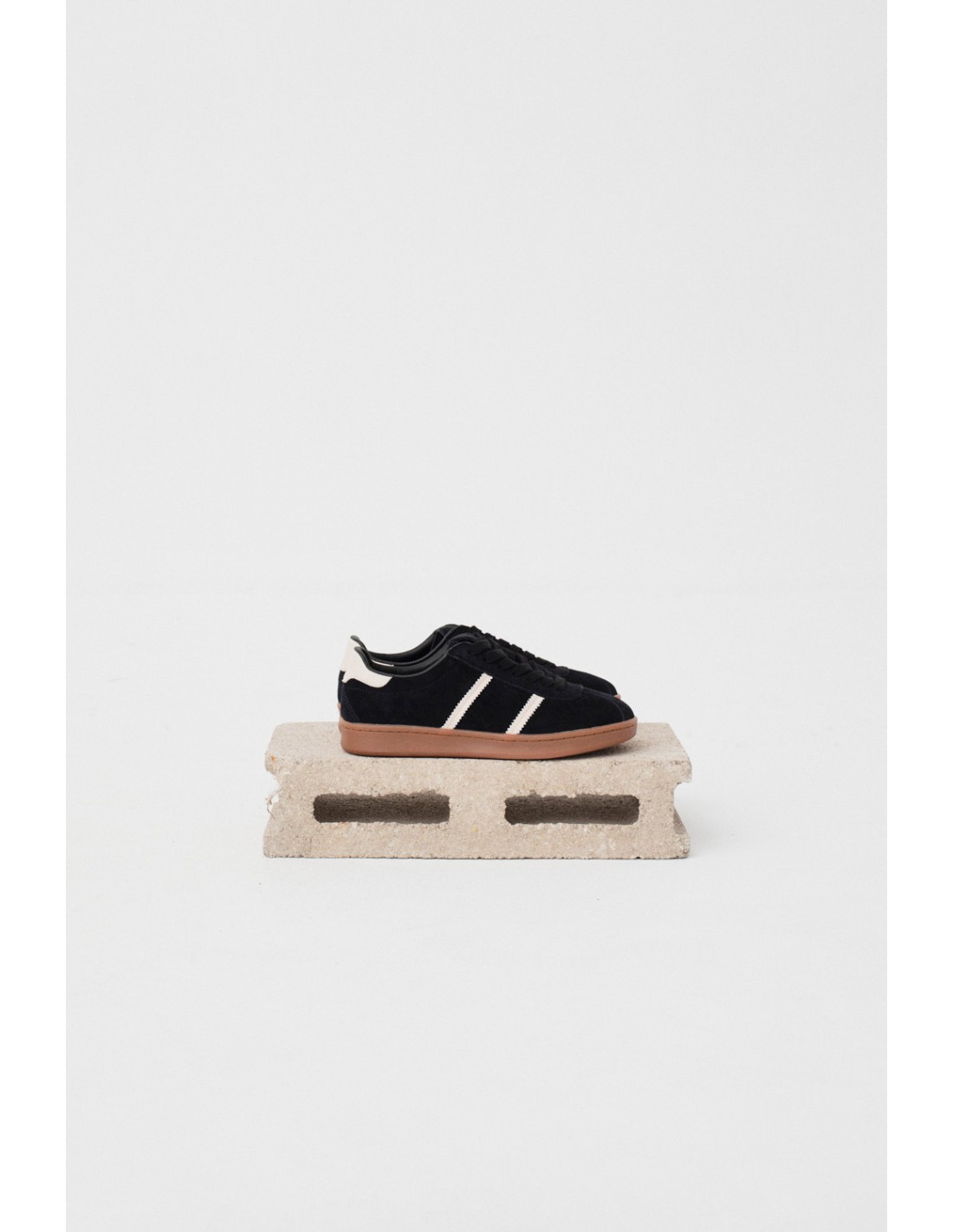 Zapatillas de cuero dividido con dos bandas laterales en color de contraste. Suela de goma y cordones planos tono sobre tono. También tiene el logo en el talón y la plantilla.