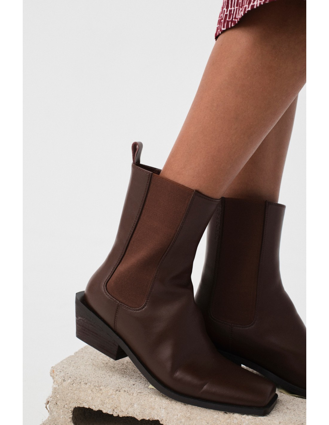 Se definen por su forma cuadrada, las Taku son botas de cuero con puntera cuadrada y tacón a juego. Cuentan con bandas elásticas rectangulares en los laterales para un ajuste cómodo y fácil de poner.