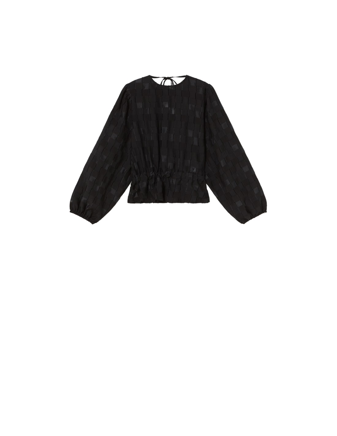 Blusa de tejido especial con frunce en la cintura, minivolante en el bajo y puños abullonados. Escote en pico en la espalda, con lazada en la nuca. Combina con los pantalones Queens.