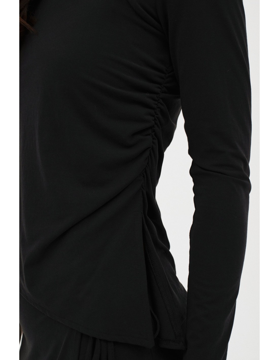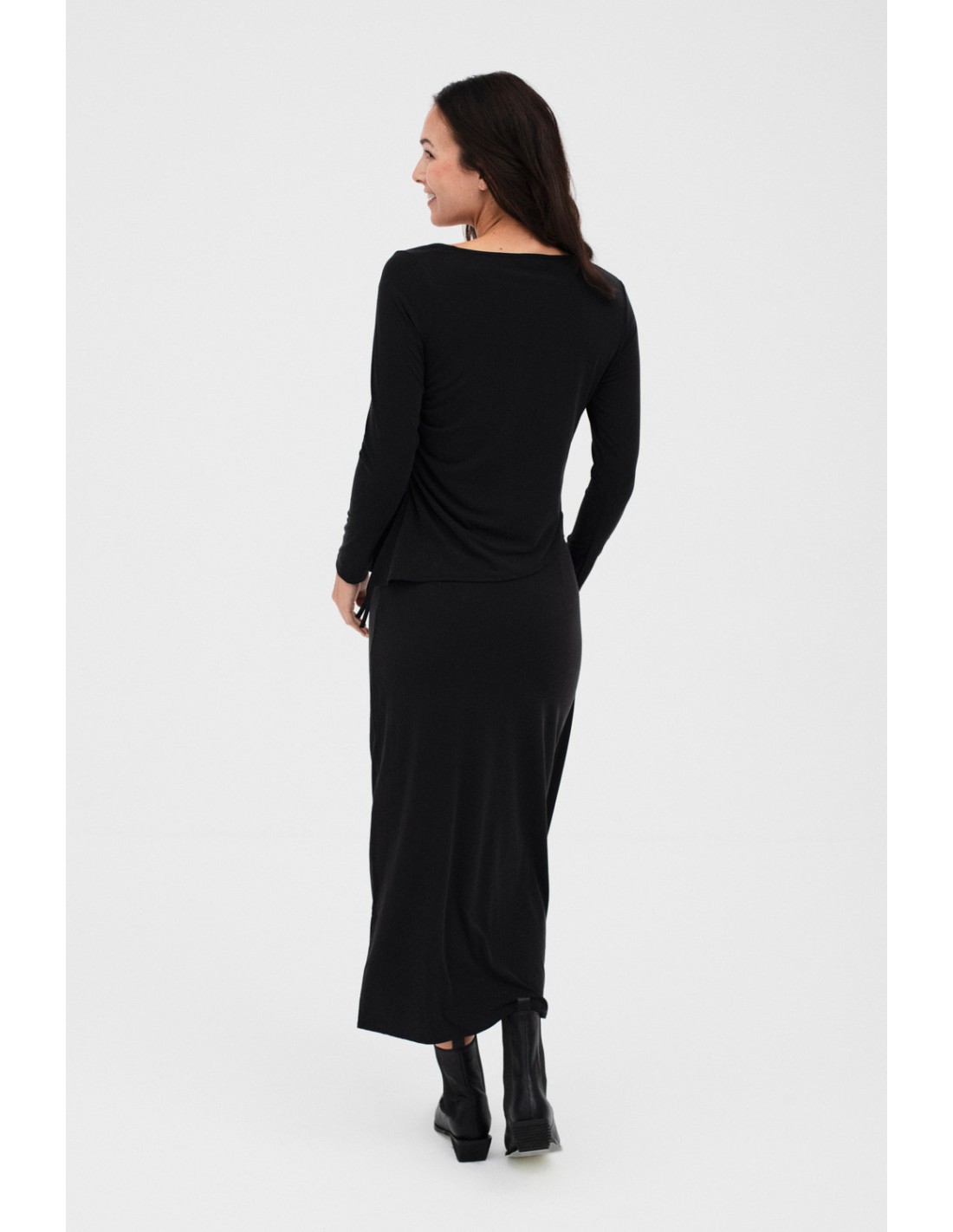 Staten es una camiseta de manga larga con efecto cupro. Tiene un escote asimétrico, abertura lateral y un delicado frunce. Combínala con la falda Spital para un look moderno y elegante.