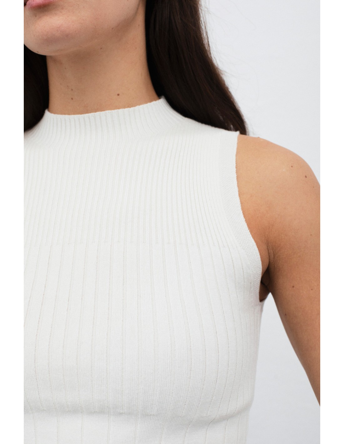 Top de punto sin mangas, con un diseño que combina tres tipos diferentes de canalé en el cuerpo. Tiene un elegante cuello alto en canalé 2x2 y detalles de punto fantasía en las sisas y el bajo. Combina a la perfección con el cárdigan Sufouh y la falda Safa.