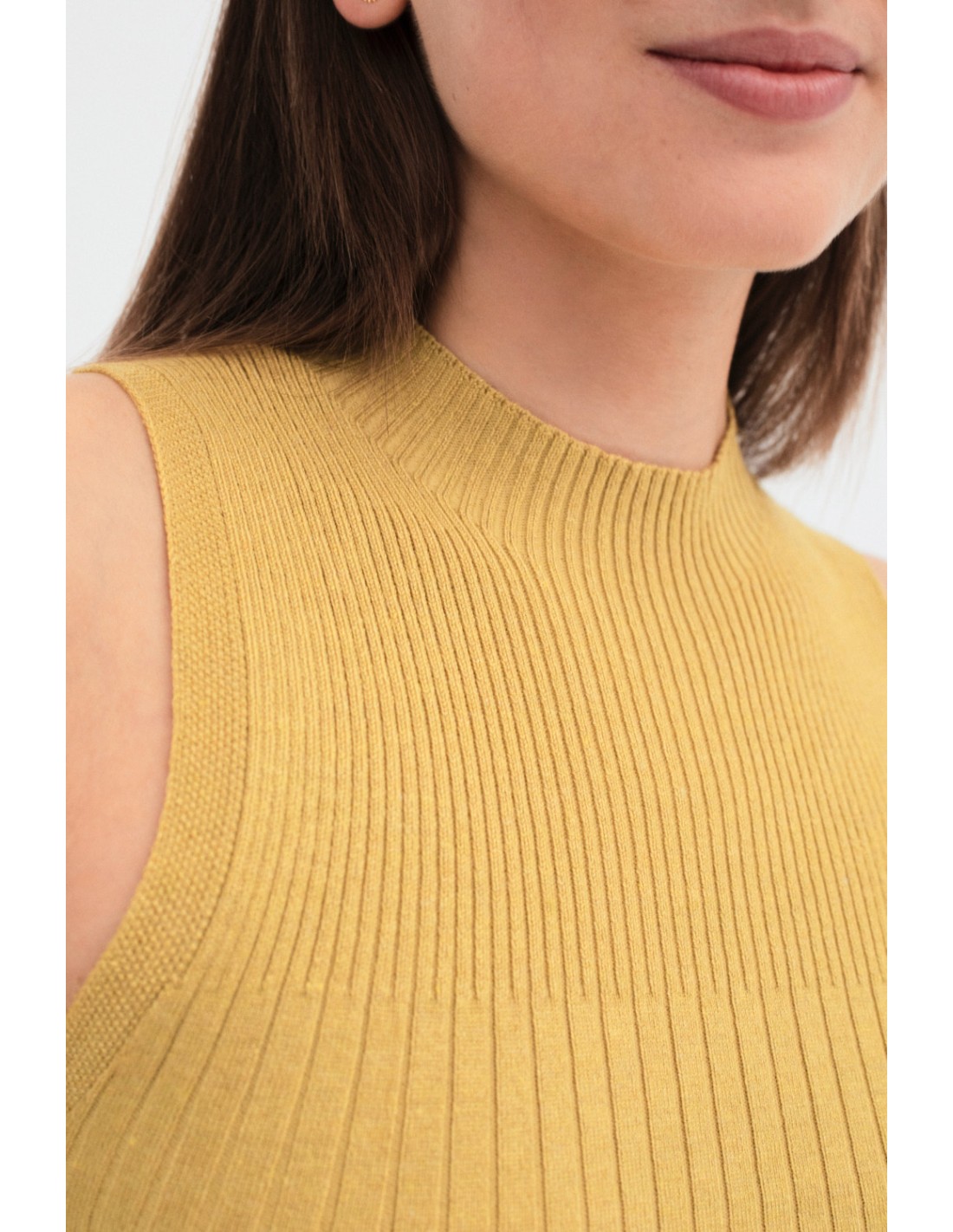 Top de punto sin mangas, con un diseño que combina tres tipos diferentes de canalé en el cuerpo. Tiene un elegante cuello alto en canalé 2x2 y detalles de punto fantasía en las sisas y el bajo. Combina a la perfección con el cárdigan Sufouh y la falda Safa.