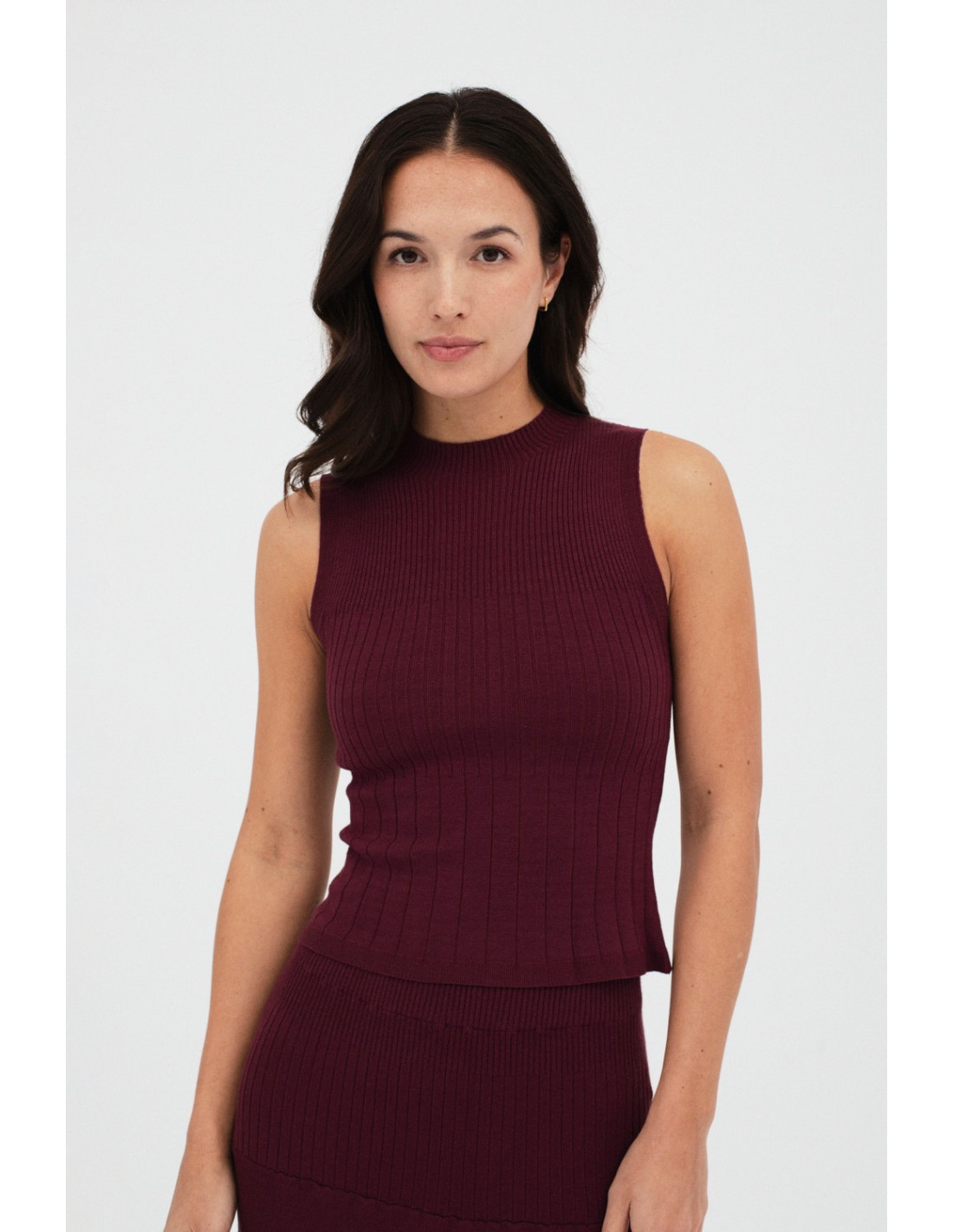 Top de punto sin mangas, con un diseño que combina tres tipos diferentes de canalé en el cuerpo. Tiene un elegante cuello alto en canalé 2x2 y detalles de punto fantasía en las sisas y el bajo. Combina a la perfección con el cárdigan Sufouh y la falda Safa.