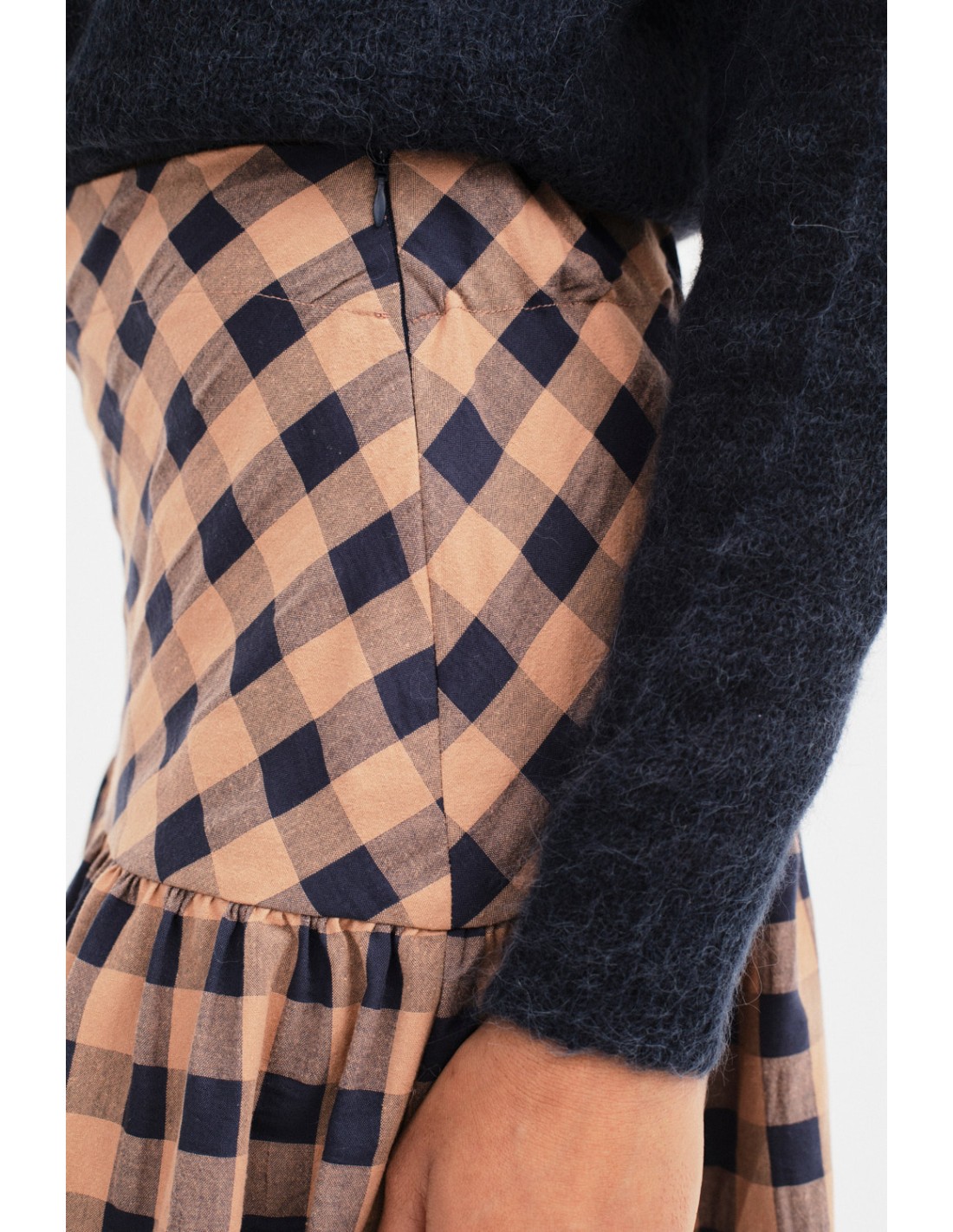 Falda larga de vichy con canesú entallado y vuelo desde la cadera, cierre de cremallera invisible en el lateral y goma plana en la espalda. Combínala con la blusa Marlene y el bolso Whitehall.