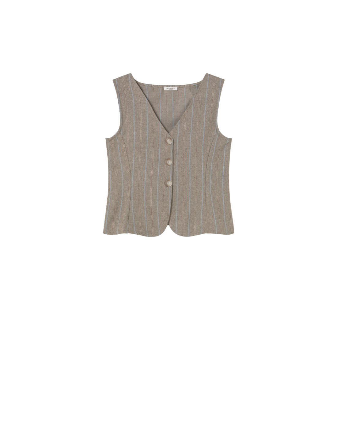 Chaleco de raya diplomática con botonadura frontal y bajos redondeados. Destaca por el detalle de la lazada en espalda, totalmente ajustable al gusto. Combina con el pantalón Vorota para el total look.