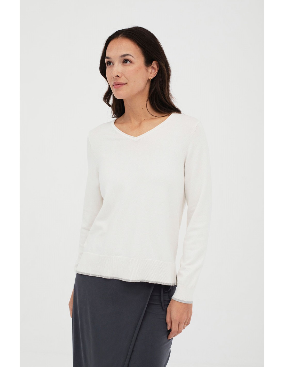 Suéter básico de punto de manga larga con cuello pico. Los puños y el bajo tienen un elegante ribete con color a contraste, que le aporta un estilo moderno y sofisticado. Combina perfectamente con los pantalones Naka.
