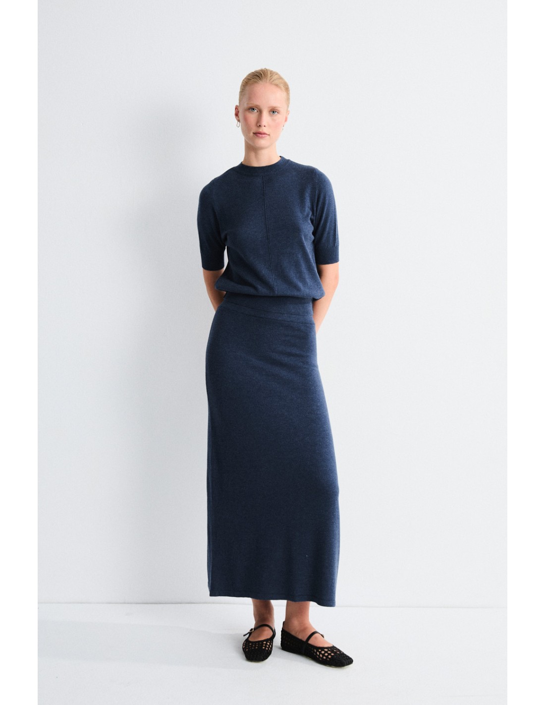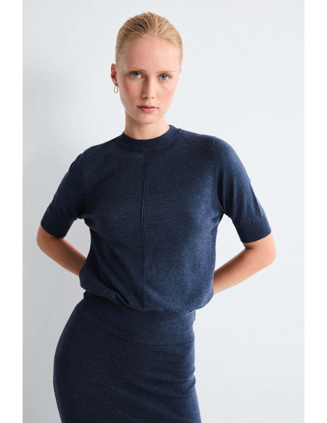 Jersey de punto suave de manga corta y escote redondo. Detalle de nervio central que aporta un toque minimalista y elegante. Combínalo con la falda Esterope para un total look.