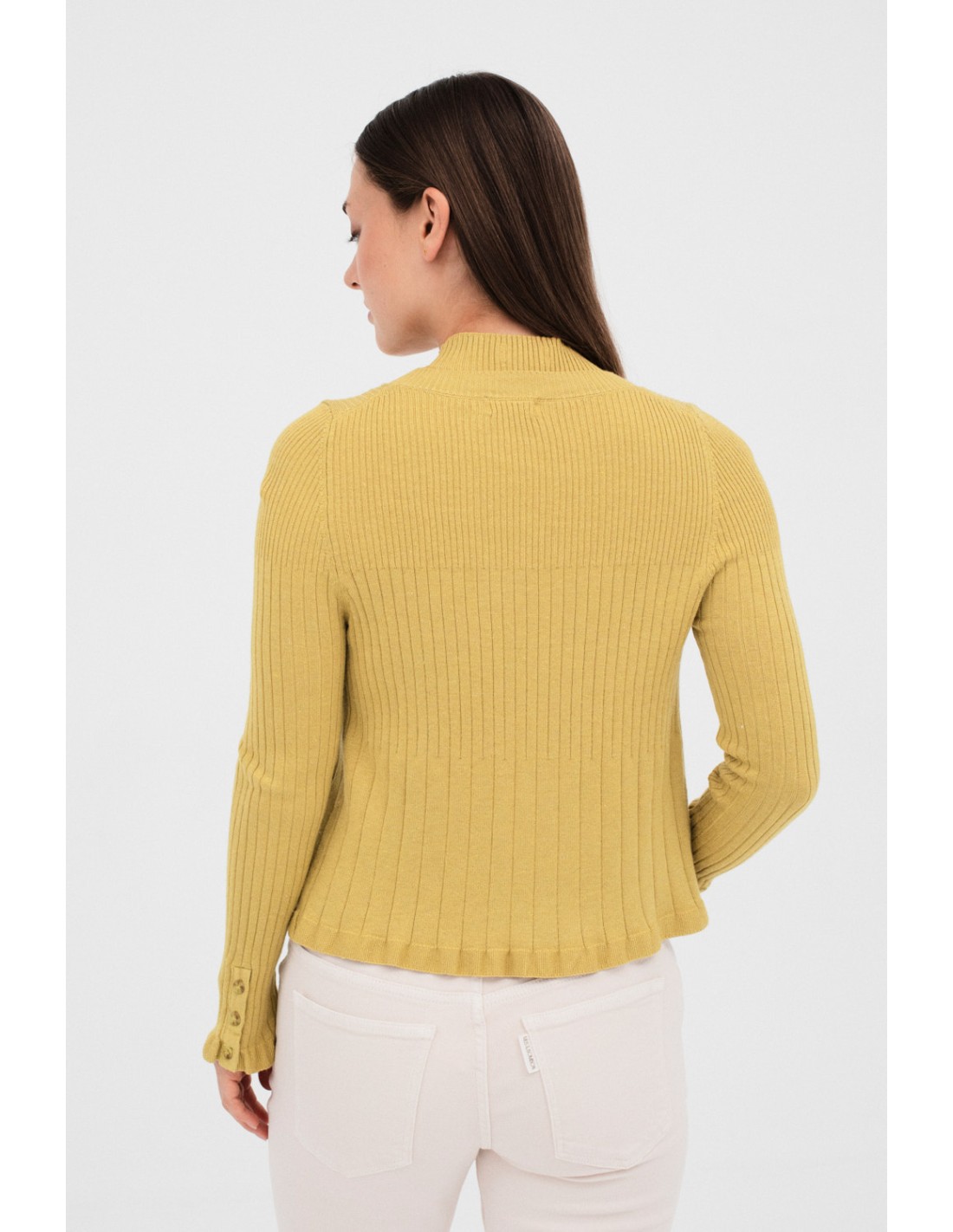 Cárdigan de manga larga y corte recto, con un diseño único que combina tres tipos diferentes de canalé en el cuerpo y dos en las mangas. Tiene un cuello redondo y una abertura con botones en frente. Los puños cuentan con un detalle de tres botones. Combina a la perfección con el top Seef, para un diseño dos piezas.