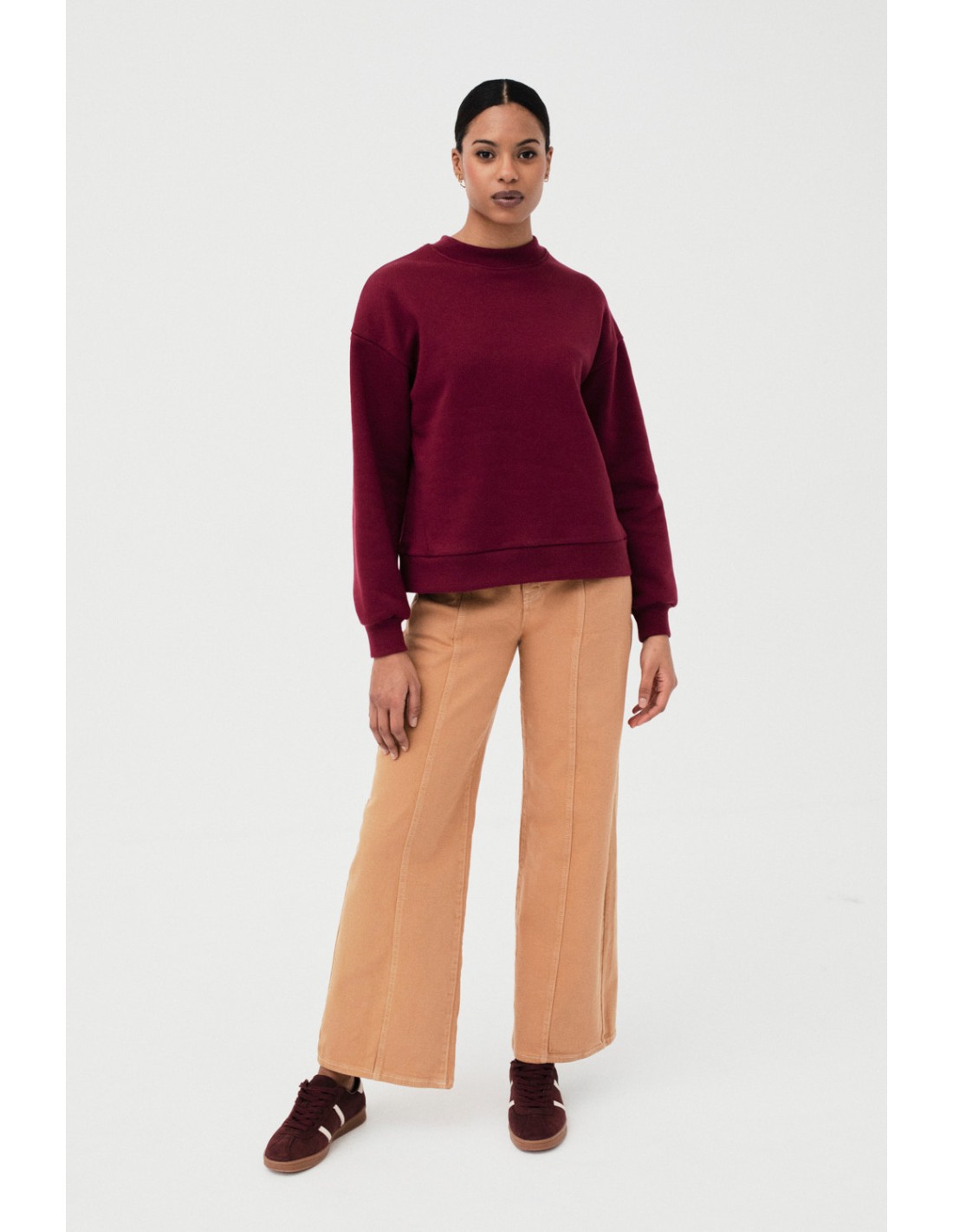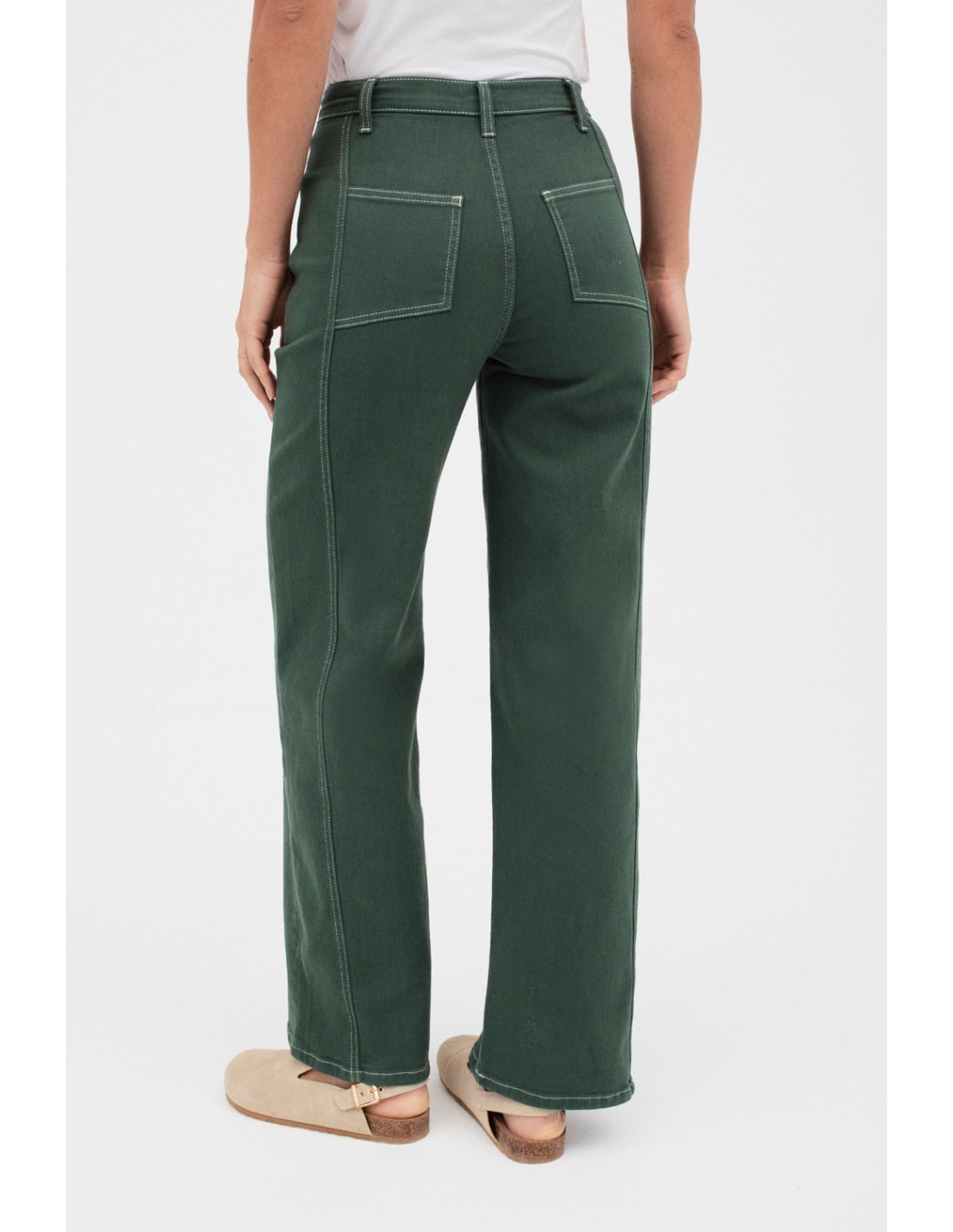 Valby es un pantalón de tiro alto y corte ancho, con costuras centrales y pespuntes a contraste. Destaca por su ajuste elegante y moderno.