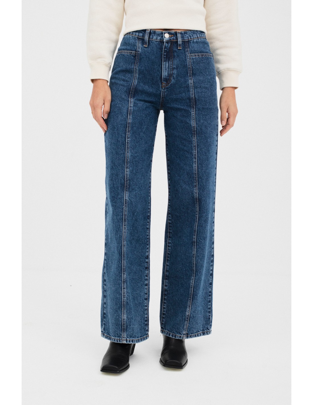 Pantalón tejano de tiro alto y corte ancho, con costuras centrales que aportan un ajuste elegante y moderno.
