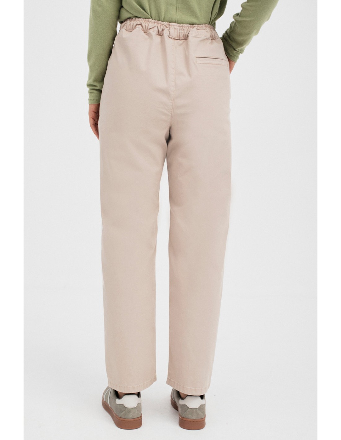 Pantalón chino con cinturilla plana en el frente y banda elástica plana en espalda. Bolsillos diagonales en la parte delantera y bolsillos traseros con cinta al bies.