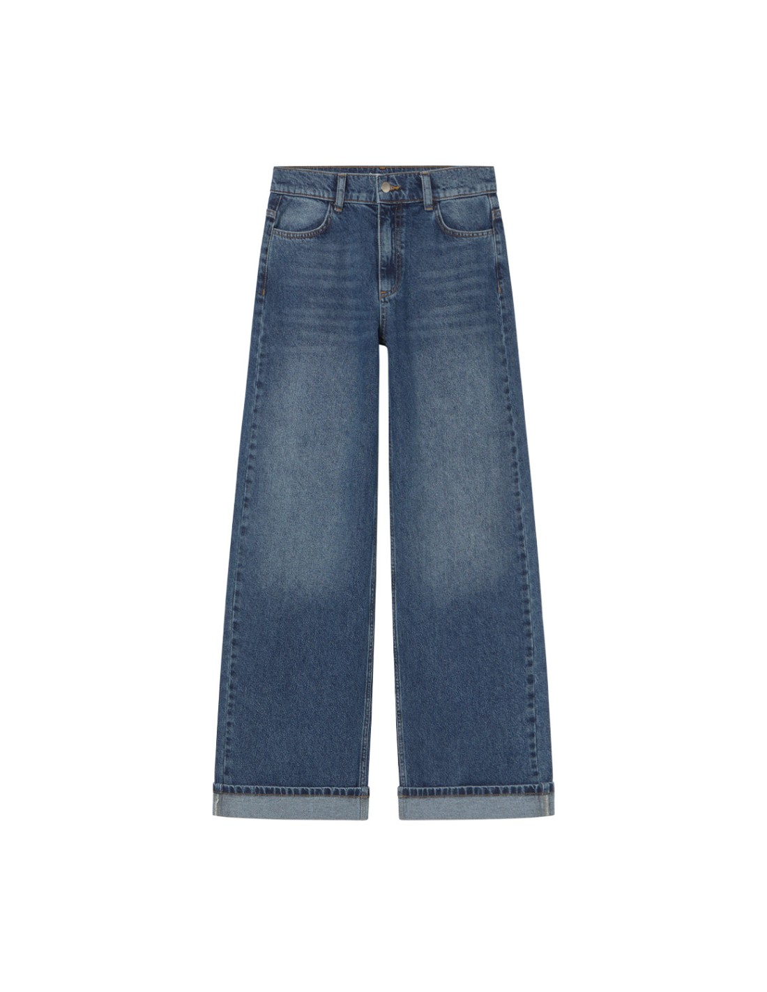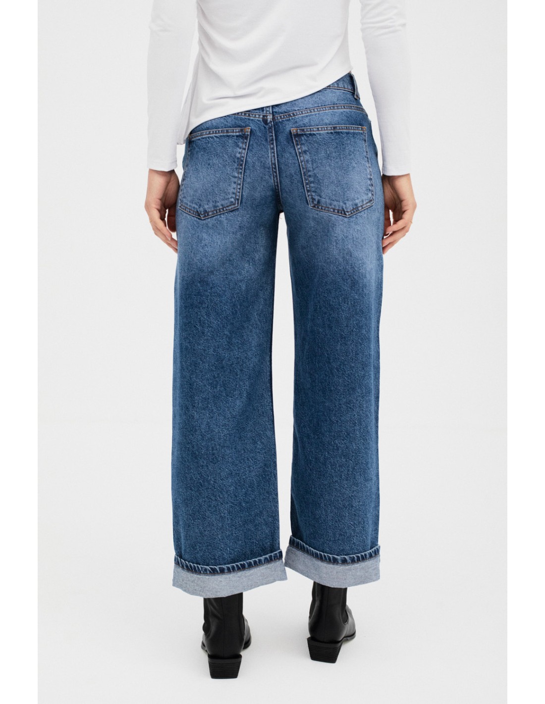 Tejanos de tiro bajo con piernas anchas y con detalle del dobladillo doblado hacia el exterior. Sus bolsillos son clásicos y cuenta con cinco trabillas para el cinturón. Perfectos para un estilo relajado y moderno.