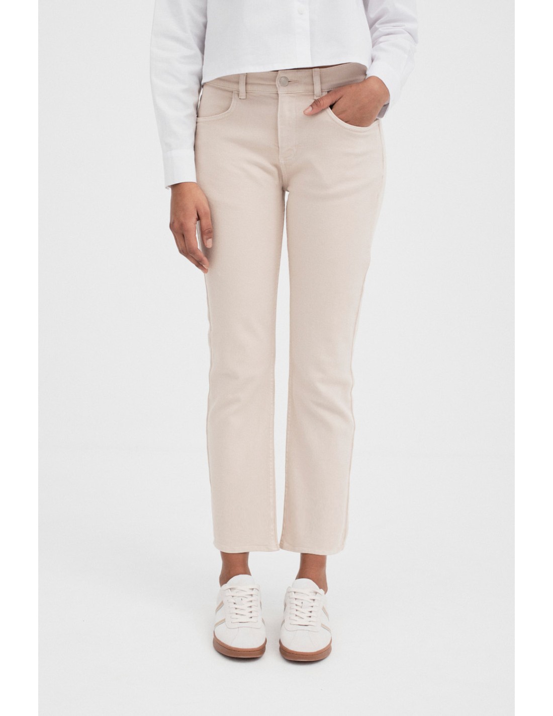 Brickell es un pantalón crop de twill, tiro medio y corte slim flare, que aporta un toque moderno y casual.