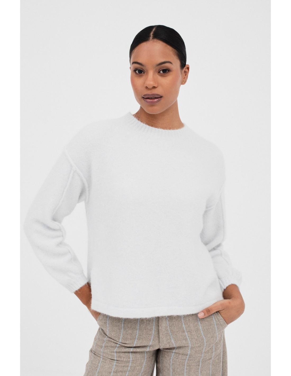 Jersey de manga larga con complemento de cuello alto añadido. Tiene un detalle de costuras exteriores y acabados en canalé, que le aportan un estilo moderno y elegante.