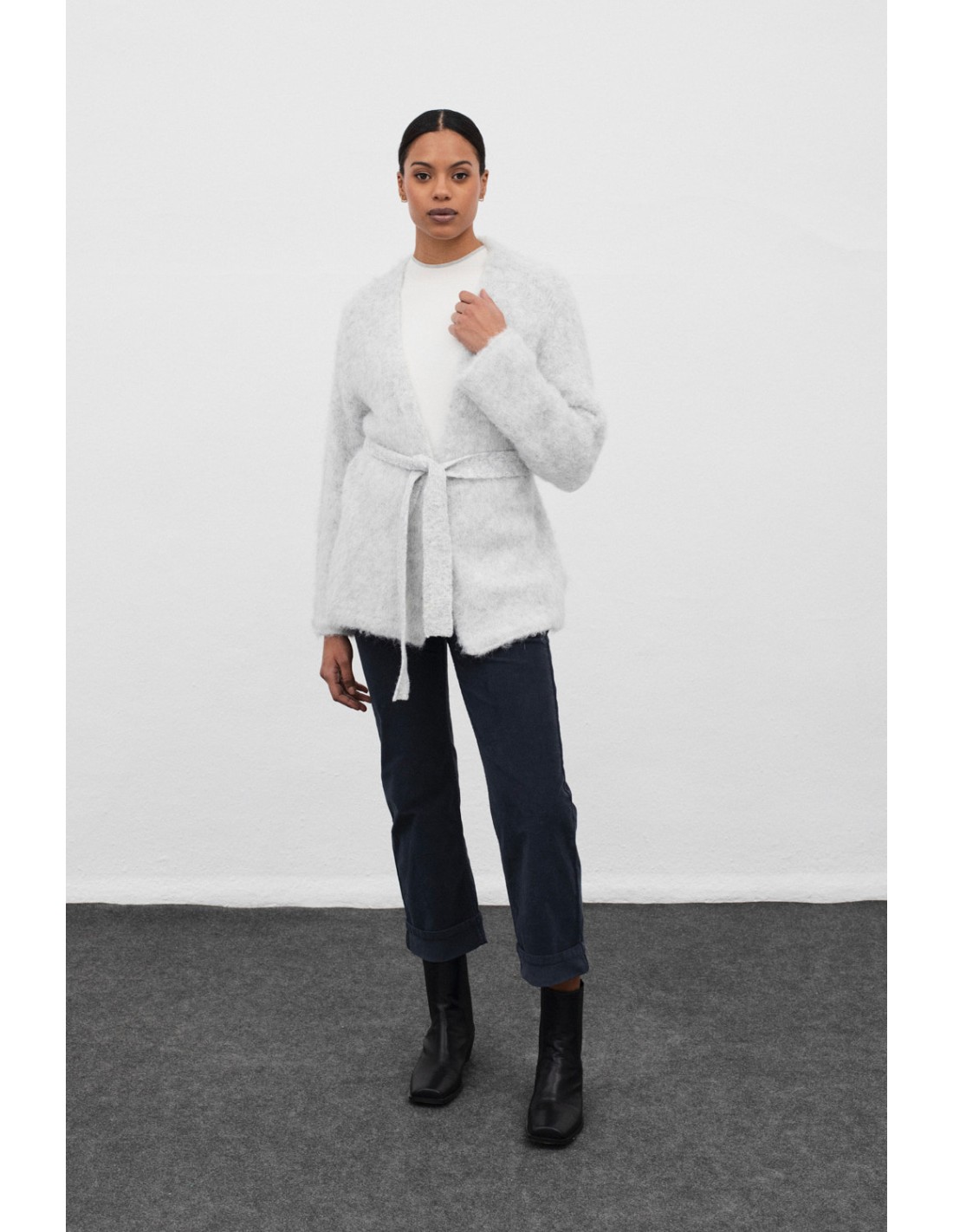 Cárdigan largo con escote pico y aperturas en las costuras laterales. Cuerpo de punto liso afelpado y cinturón plano. Ofrece un diseño sofisticado e único.
