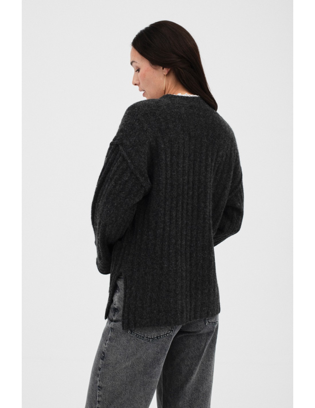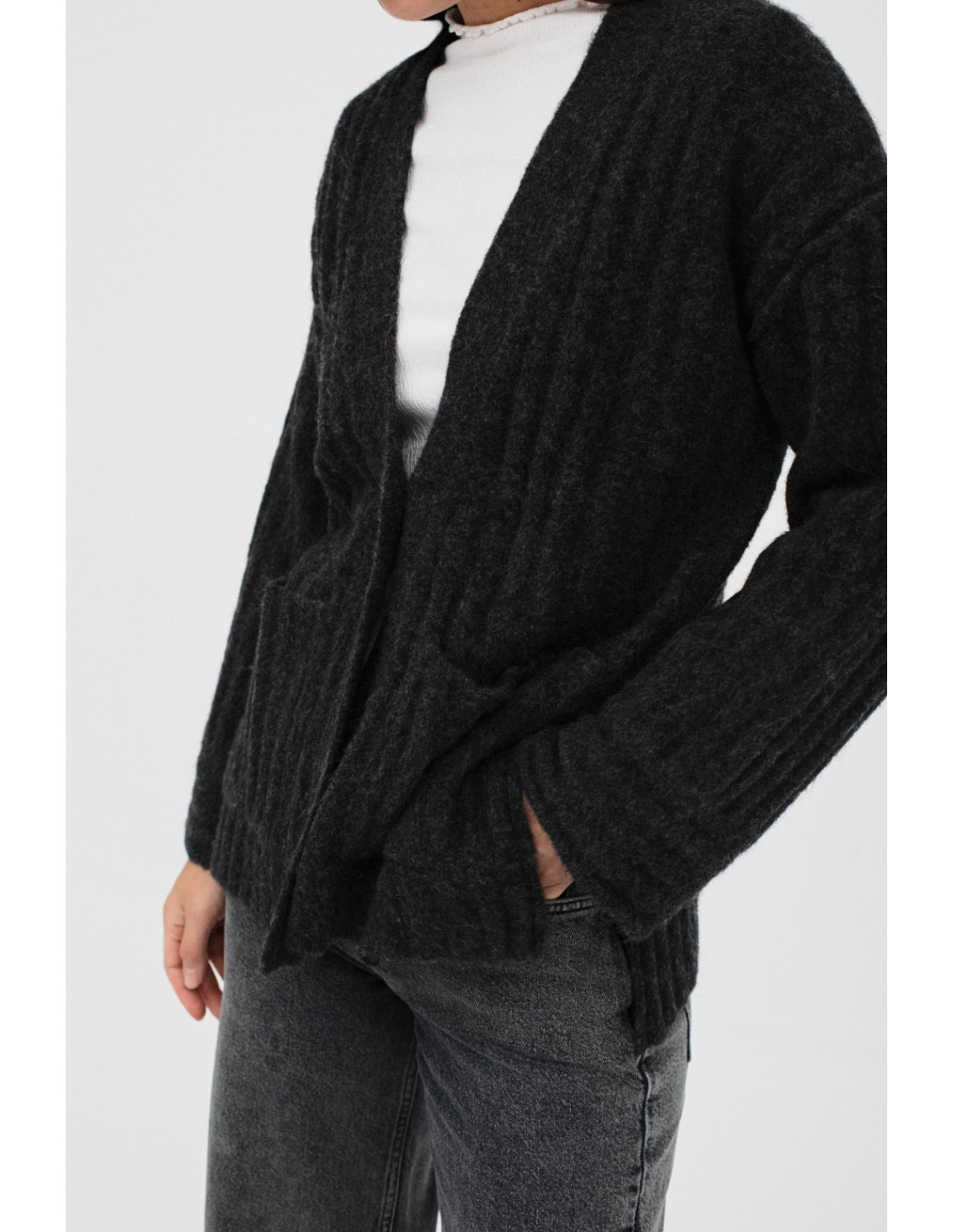 Cárdigan de punto en canalé con detalle de puños de canalé horizontal doblados hacia el exterior. Abertura frontal con botones y aberturas en los costados. Cuenta con dos bolsillos frontales. Combina con los complementos Bukon y Busan.