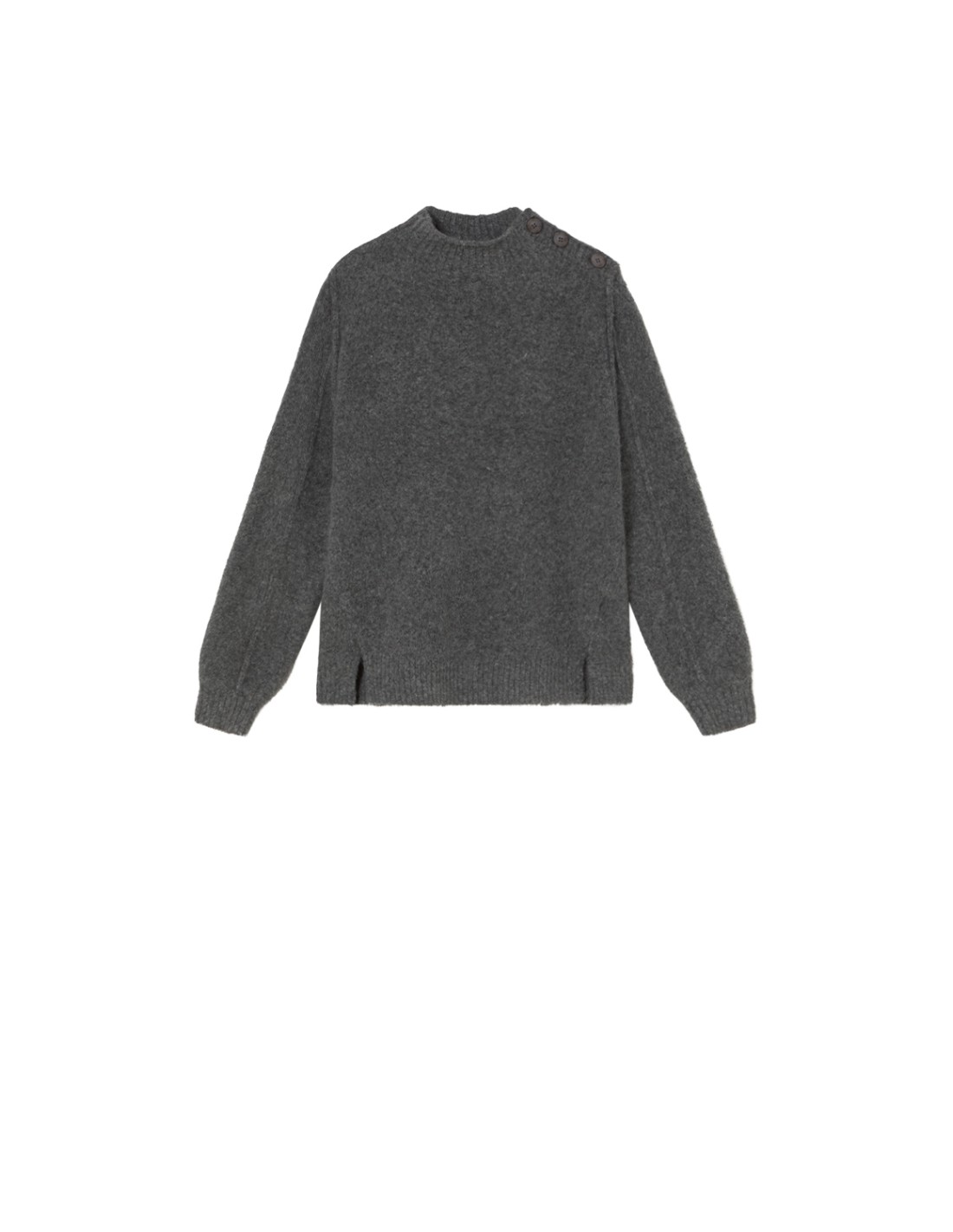 Jersey de manga larga y cuello alto con detalle de botonadura lateral en cuello y hombro. Los puños tienen botones que permiten crear un elegante pliegue, añadiendo un toque único y sofisticado.
