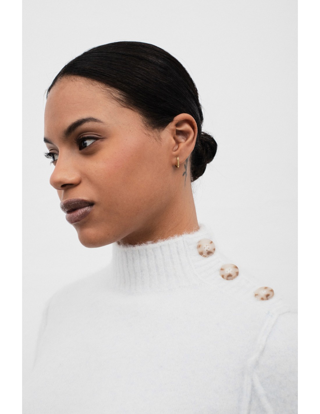 Jersey de manga larga y cuello alto con detalle de botonadura lateral en cuello y hombro. Los puños tienen botones que permiten crear un elegante pliegue, añadiendo un toque único y sofisticado.