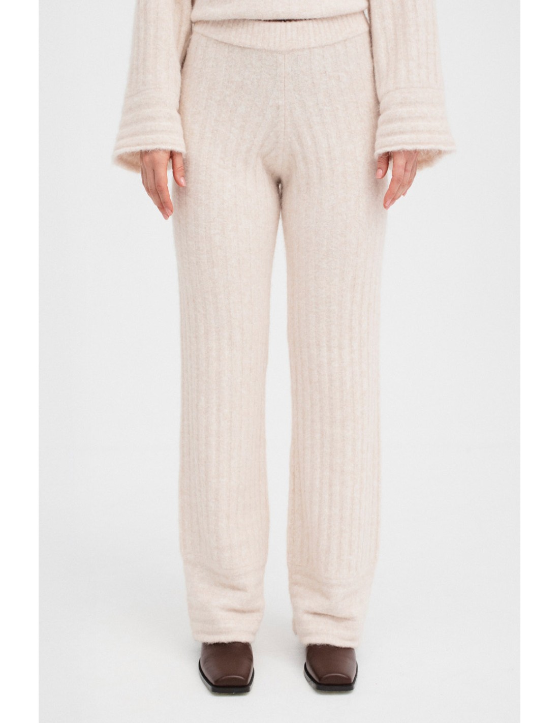 Pantalones de punto en canalé, con cintura elástica para un ajuste perfecto. El bajo tiene el detalle de un elegante canalé horizontal, añadiendo un detalle moderno y elegante. Combina perfectamente con el jersey Song y el cárdigan Gangam para un look completo.