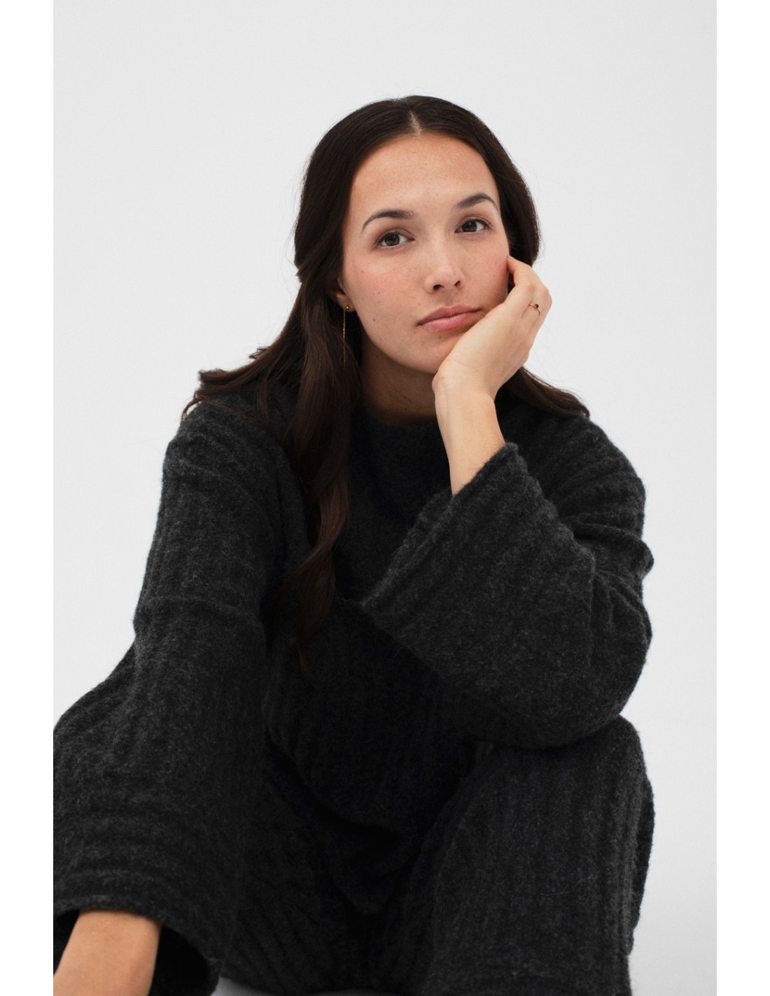 Jersey de manga larga con un elegante cuello alto en canalé. El cuerpo y las mangas presentan el detalle de un canalé horizontal en los puños. El bajo también tiene un acabado en canalé, con una abertura diagonal en el costado izquierdo. Combina a la perfección con el pantalón Nowon.