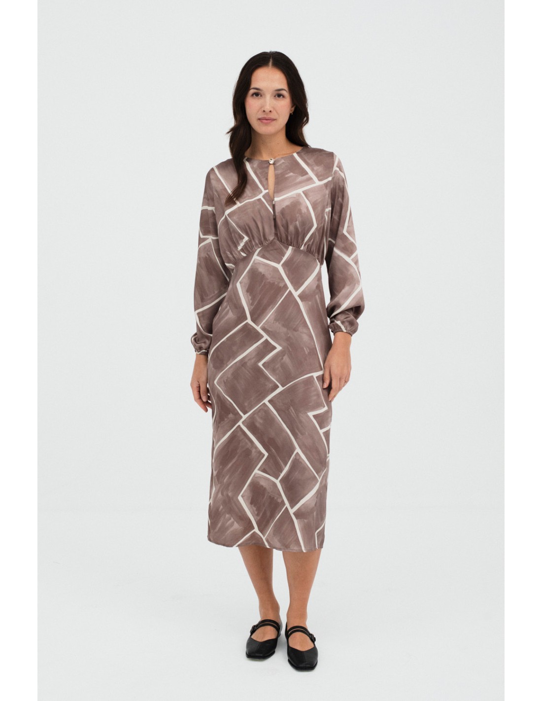 Vestido estampado largo de manga larga, con lágrima en el escote y botón metálico de fantasía. Tiene un frunce en el talle y puños ligeramente abullonados, ideal para un look romántico.