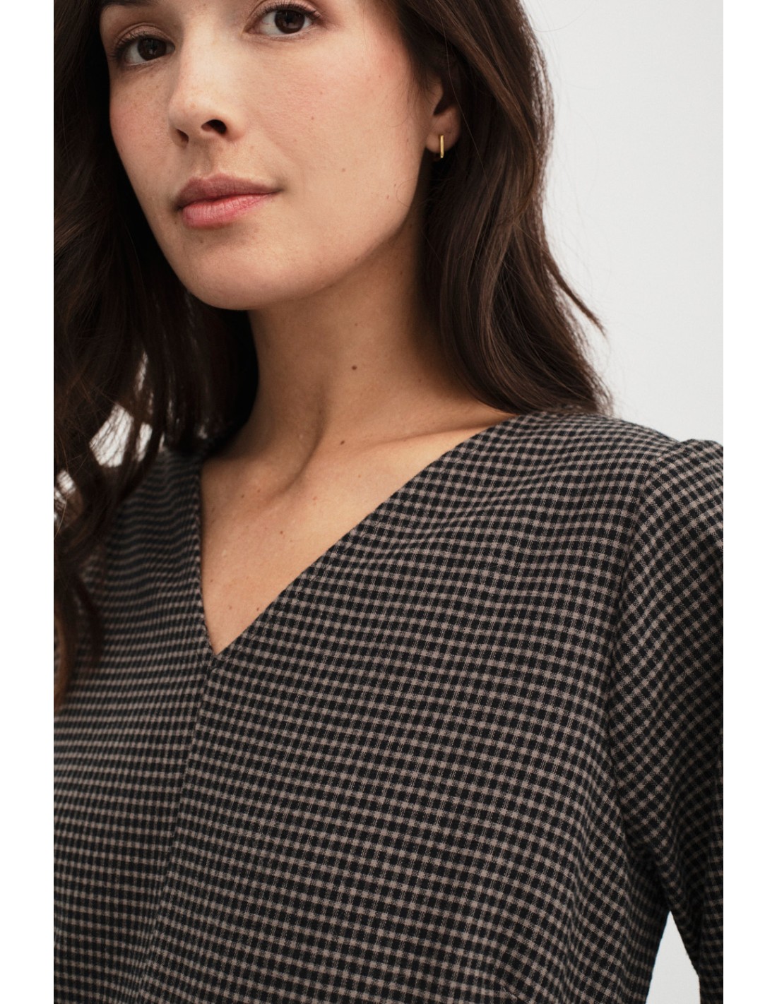 Vestido con manga abullonada y escote en pico y cierre de cuello con lazada. Cuenta con bolsillos en las costuras laterales para un toque práctico y elegante.