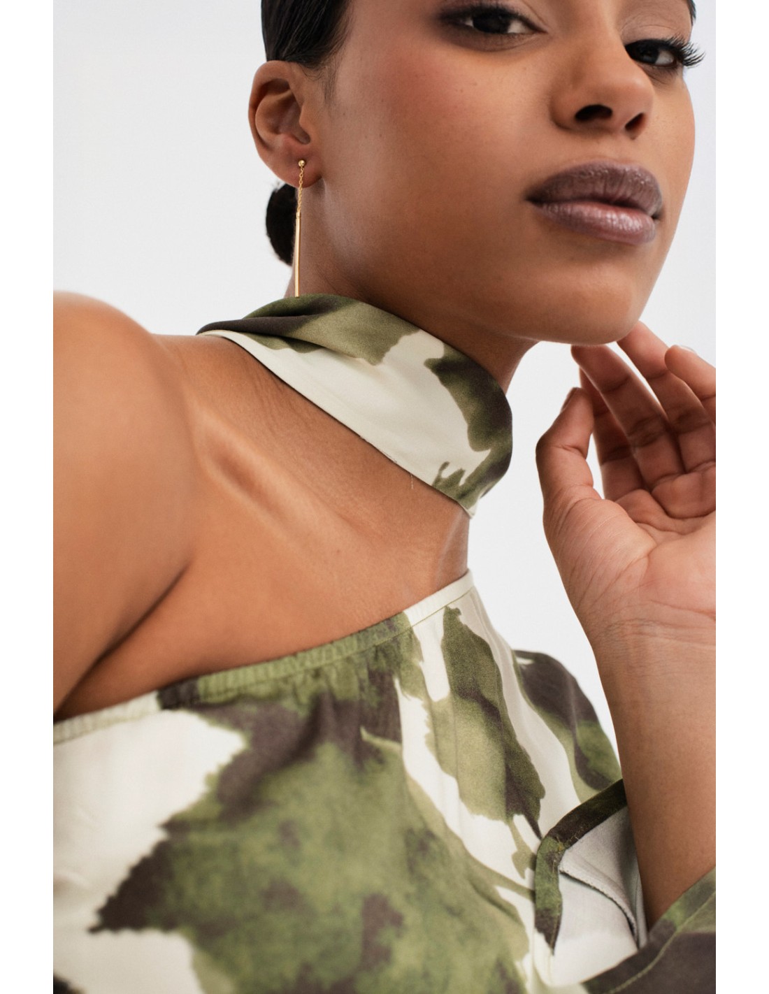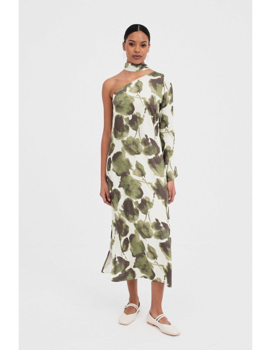 Vestido asimétrico con un estampado único. Diseñado con una manga y una abertura lateral. Incluye un pañuelo del mismo estampado con el que puedes hacer un chocker para darle un toque elegante. Cierre con cremallera invisible en lateral.