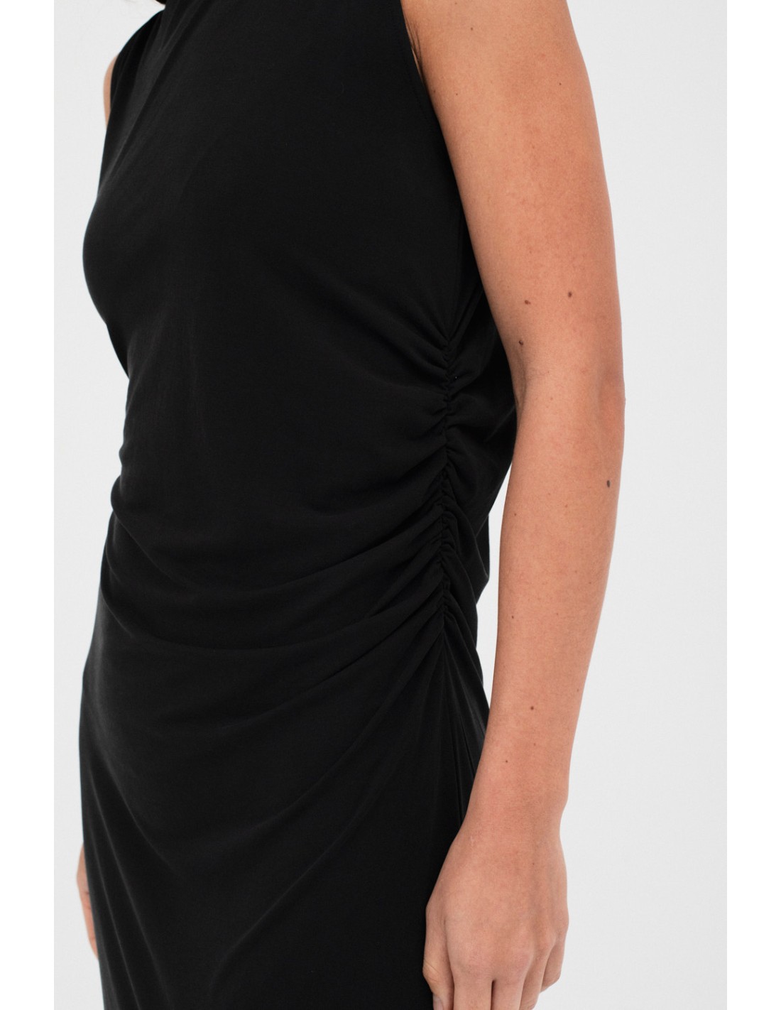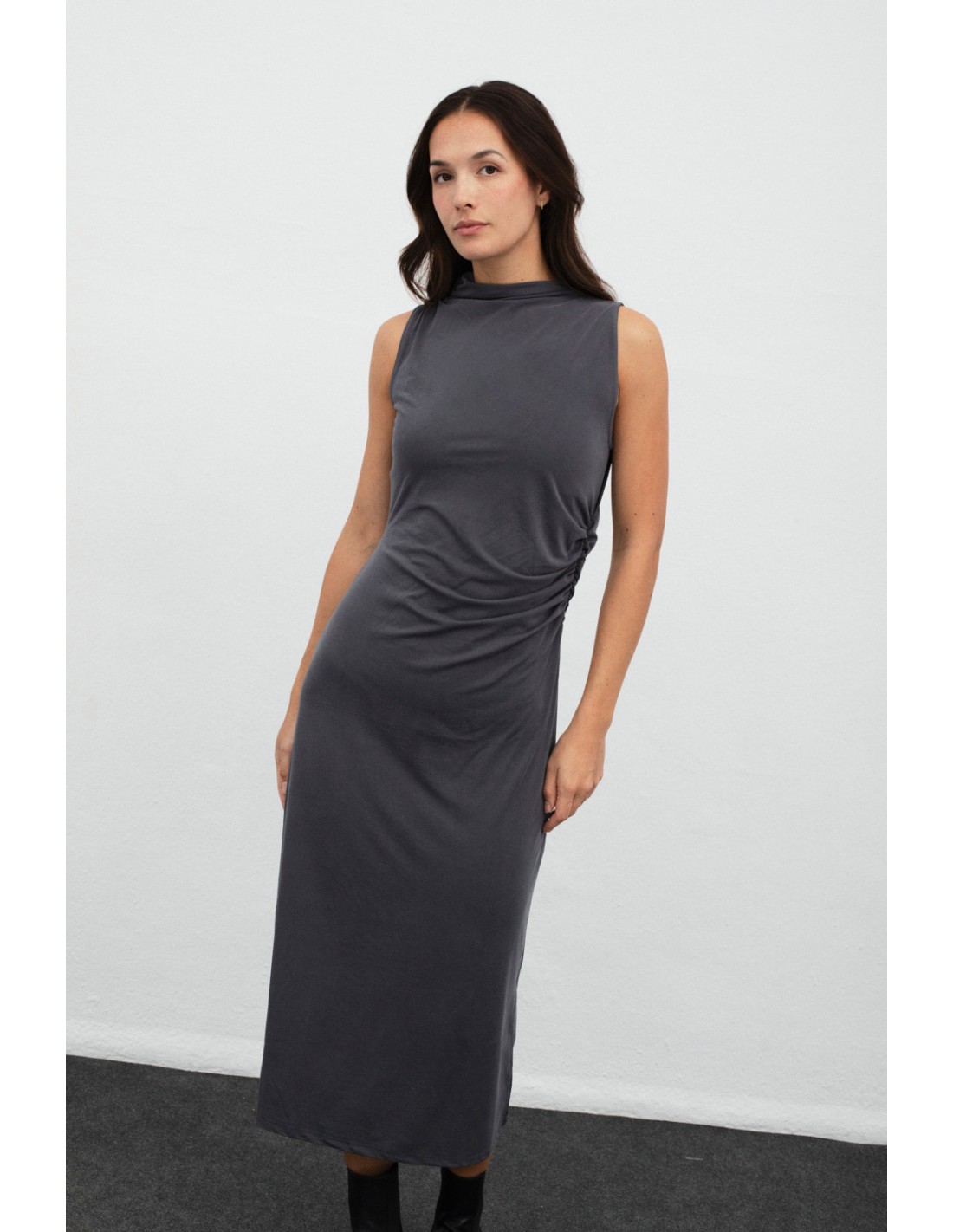 Vestido de modal con efecto cupro. Destaca por su escote diagonal y detalles fruncidos en el hombro y la cintura. Perfecto para un look elegante y cómodo con un toque moderno.