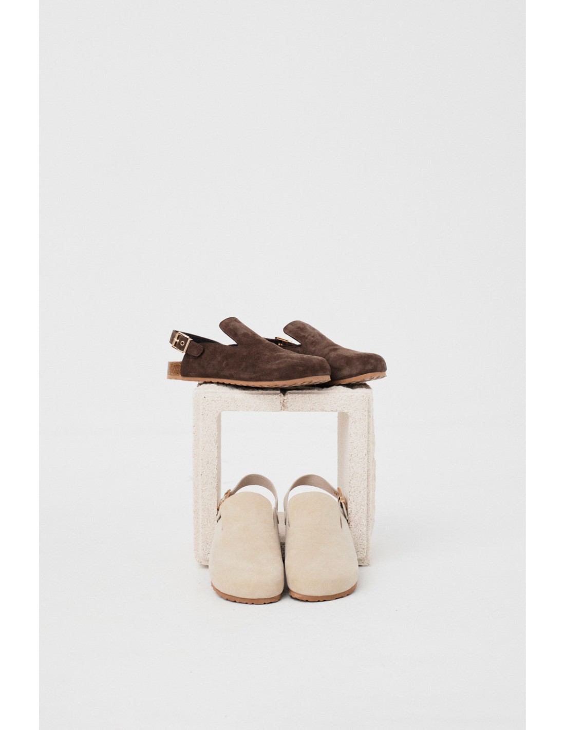Sabots en daim, ouverts à l'arrière et fermés avec une sangle ajustable et une boucle dorée. Ils ont une semelle en caoutchouc et le logo gravé sur la semelle du talon.