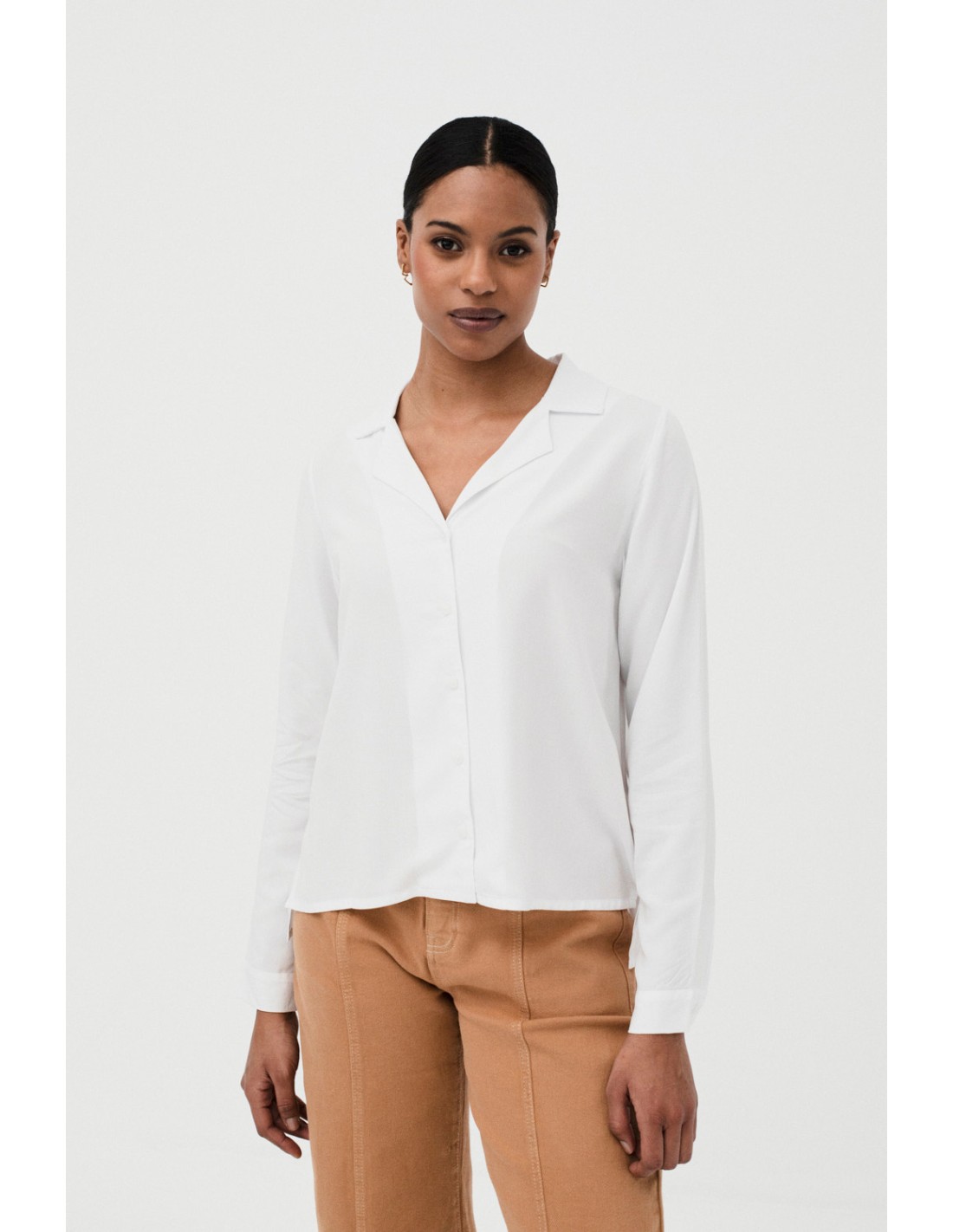 Chemise en viscose douce et fluide, avec col à revers et boutonnage frontal qui apporte une touche classique et élégante. Elle présente un pli dans le dos et des boutons sur les poignets, ce qui en fait une pièce polyvalente et stylée.