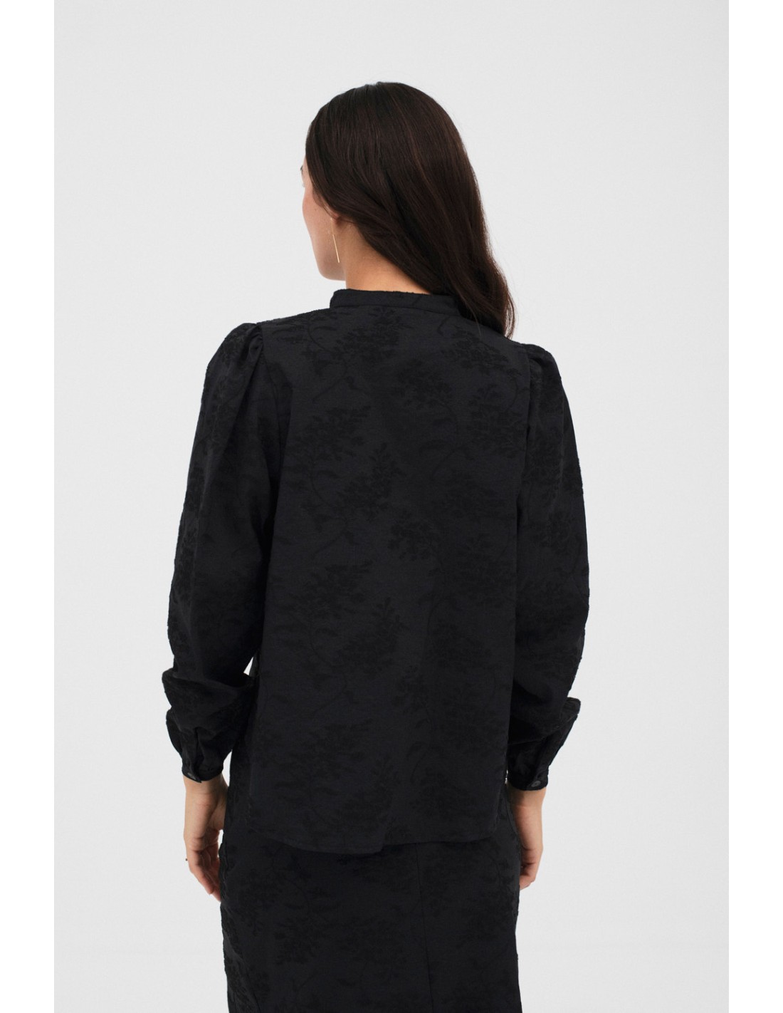Blouse en jacquard avec col mao, bas arrondis et manches larges bouffantes. Parfaite pour un look élégant, elle se distingue par sa touche romantique.