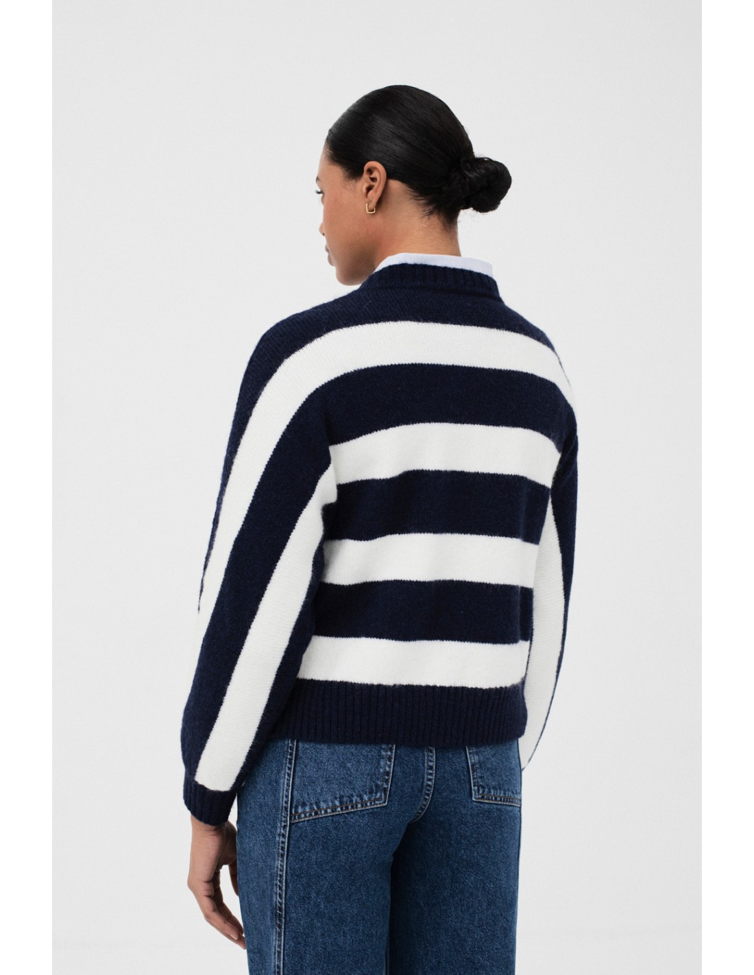 Pull basique à rayures avec manches japonaises et finitions en côte, lui donnant une touche unique et moderne.