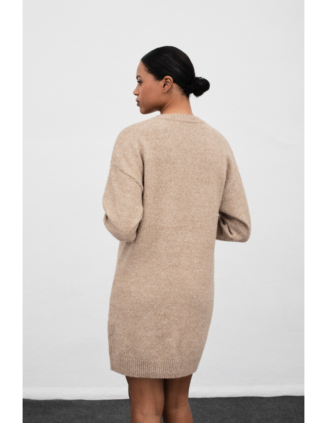 Robe courte en tricot avec finitions en côte et détail de patte de boutonnage sur le devant, lui donnant un style sophistiqué et polyvalent.