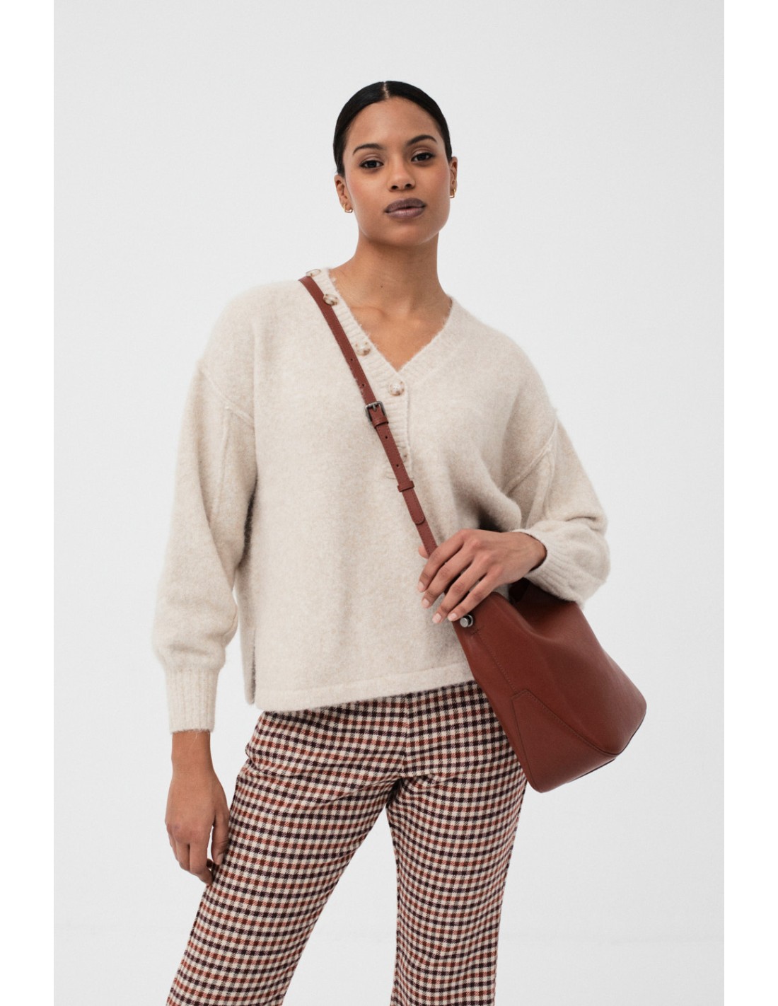 Pull à col en V avec une fausse ouverture à boutons et des poignets en côtes, lui donnant une touche unique et polyvalente.
