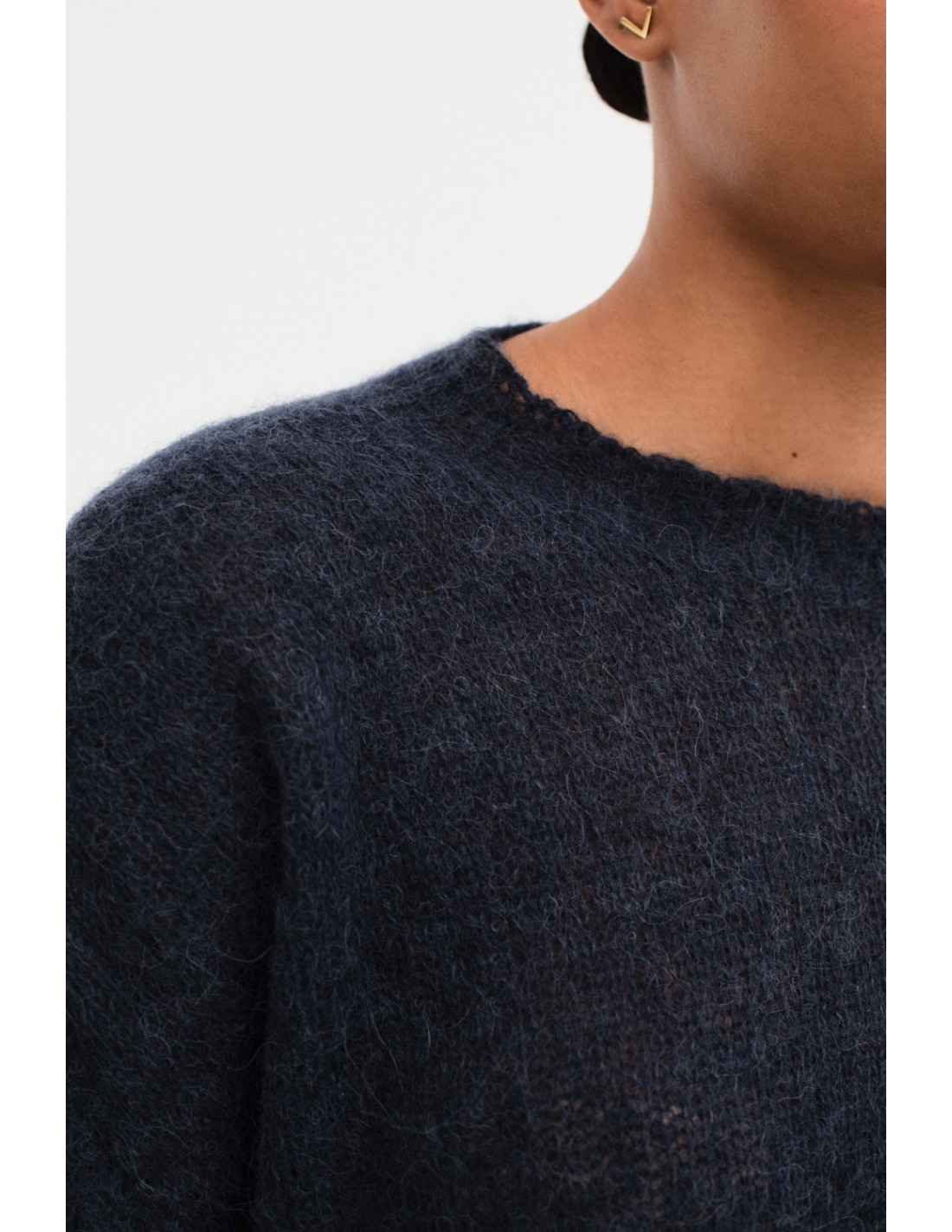 Un pull en tricot lisse avec col rond et manches longues. Il est tricoté intégralement, avec des finitions en bord-côte, un bas arrondi et un design légèrement plus court à l'avant.