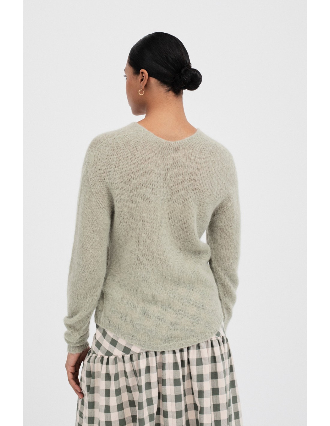 Trevi est un pull en tricot lisse avec un col en V, des manches longues et des bords arrondis. Il est tricoté intégralement, parfait pour un look confortable et moderne.
