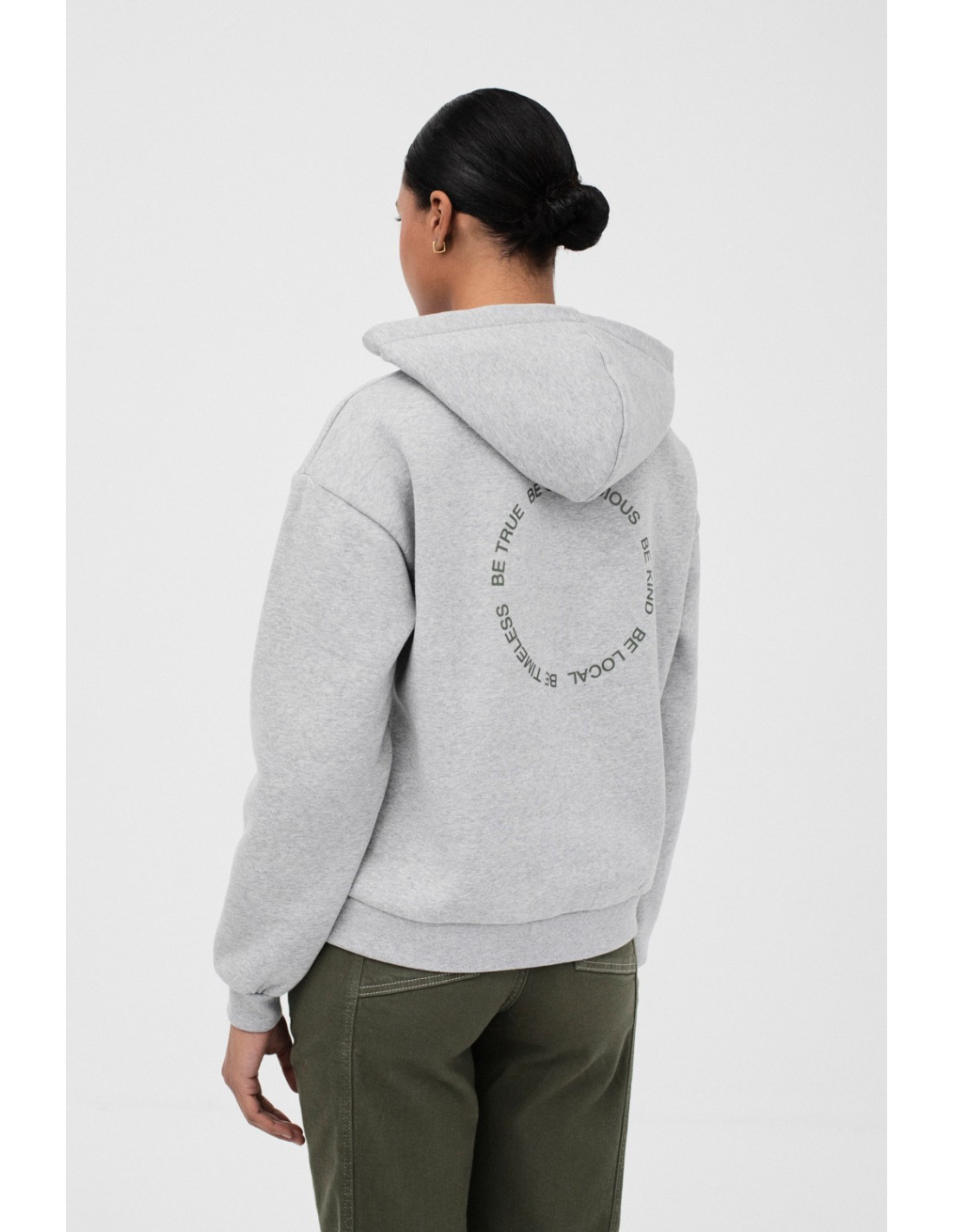 Sweat-shirt molletonné avec capuche, finitions en bord-côte aux poignets et à l'ourlet, et imprimés textuels en forme circulaire : grand dans le dos et petit sur la poitrine.