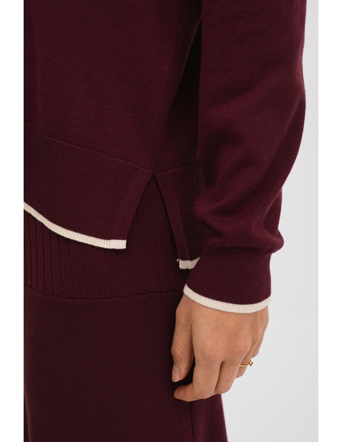 Pull basique en tricot à manches longues et col en V. Les poignets et le bas sont dotés d'un élégant bord contrasté, ce qui lui confère un style moderne et sophistiqué. Se combine parfaitement avec le pantalon Naka.
