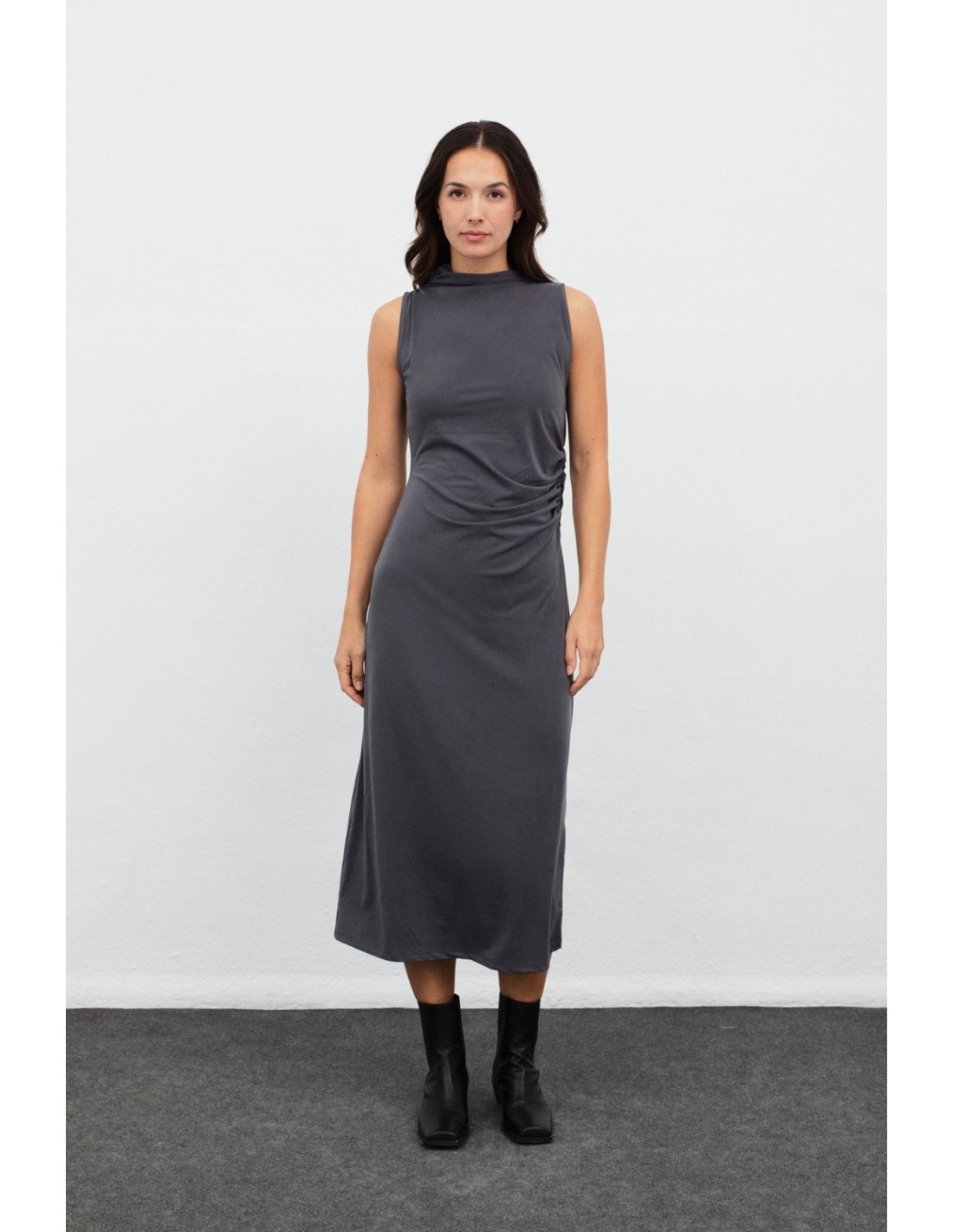 Robe en modal avec effet cupro. Elle se distingue par son décolleté diagonal et ses détails froncés à l'épaule et à la taille. Parfaite pour un look élégant et confortable avec une touche moderne.