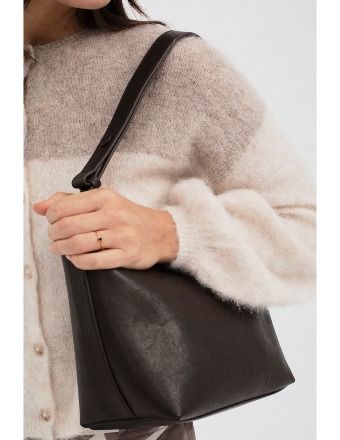 Sac en cuir avec fermeture éclair, anse réglable avec bouton recouvert et passants. À l'intérieur, une poche avec bord en cuir et une autre poche avec fermeture éclair. Le logo de Mus&Bombon est gravé à l'extérieur.