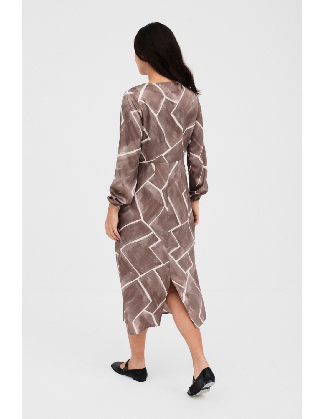 Long printed dress with long sleeves, teardrop neckline and fancy metal button. It has a gathering at the waist and slightly puffed cuffs, ideal for a romantic look.