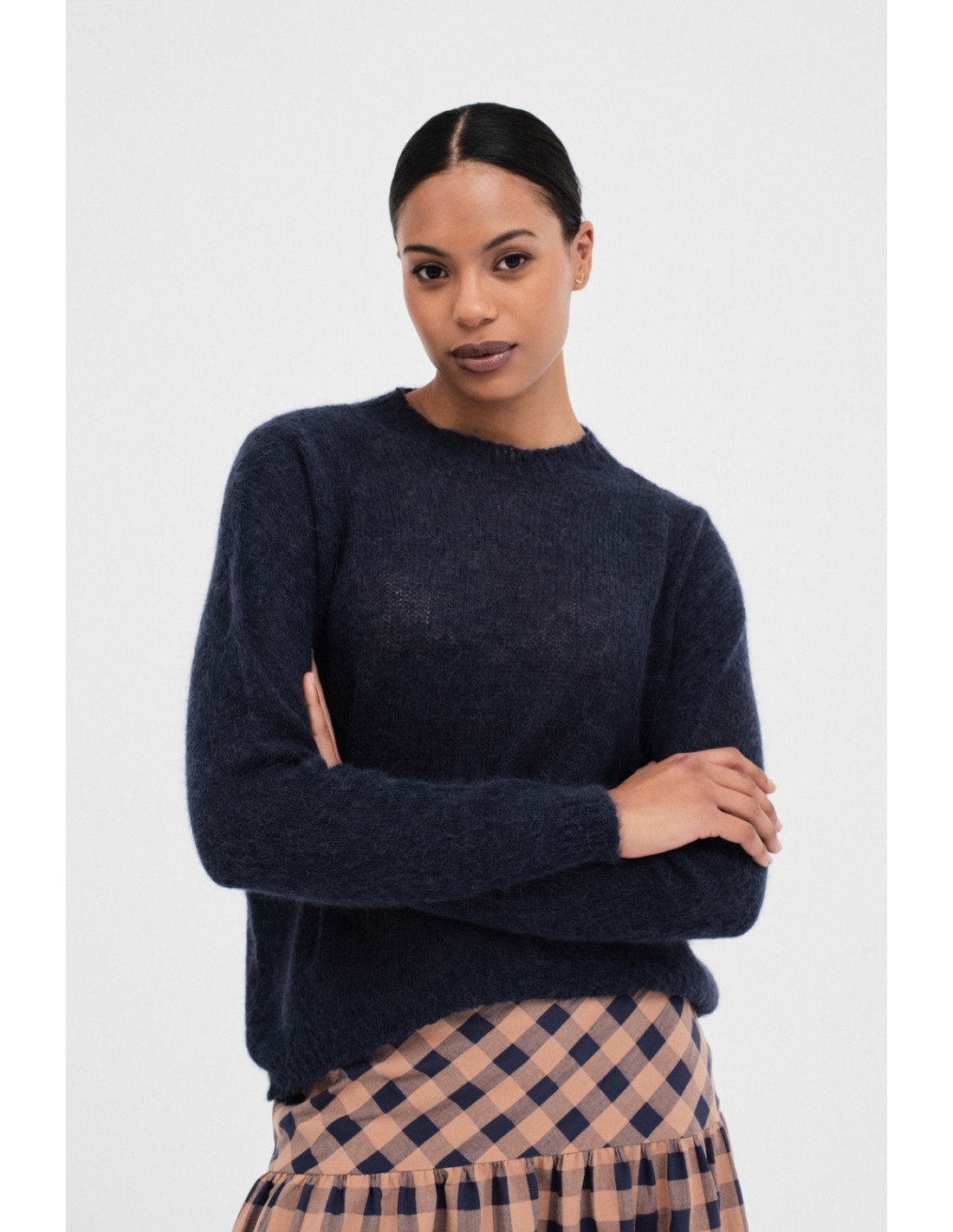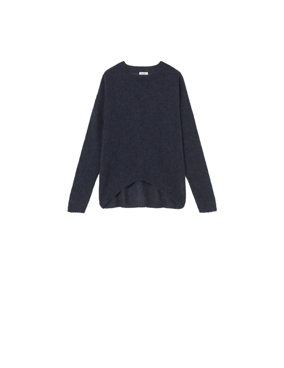 A plain knitted jumper with a round neck and long sleeves. It is completely made of tricot and features ribbed finishes, rounded hem and a slightly shorter design on the front.