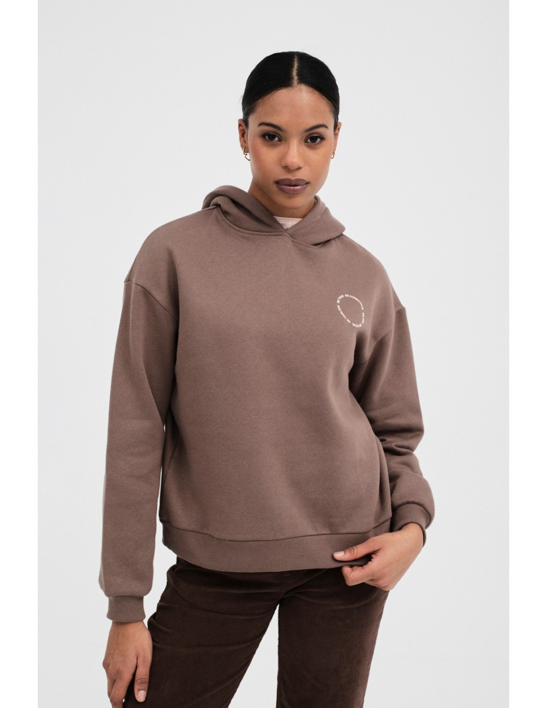 Quilted sweatshirt with hood, ribbed cuffs and hem and printed with circular text: large on the back and small on the chest.