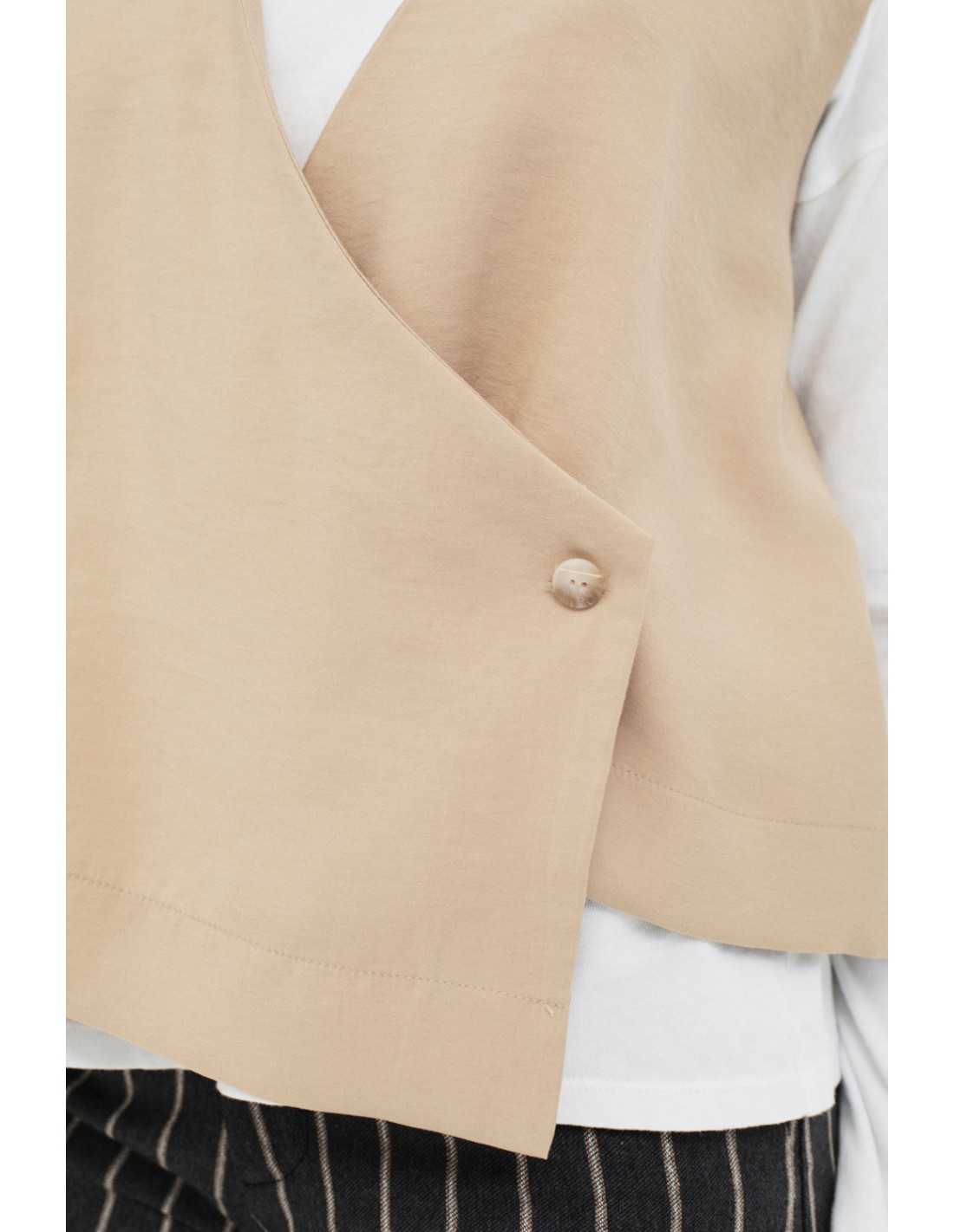 Short vest with side button closure, V-neckline and false pocket on the right side. The right side overlaps the left side, and is slightly longer. Wear it with the Billwerder pants for a total look.