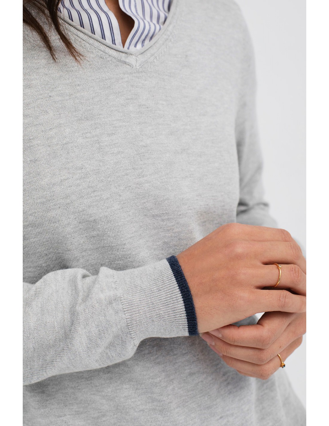 Basic knitted jumper with long sleeves and a V-neck. The cuffs and hem are trimmed with an elegant contrasting colour, giving it a modern and sophisticated style. Coordinates perfectly with the Naka trousers.