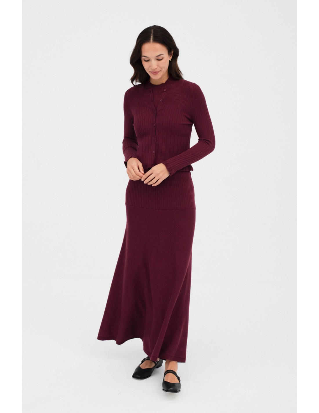 Long-sleeved, straight-cut cardigan with an unique design combining three different types of ribbing on the body and two on the sleeves. It has a round neck and a front button placket. The cuffs feature a three-button detail. It pairs perfectly with the Seef top for a two-piece design.