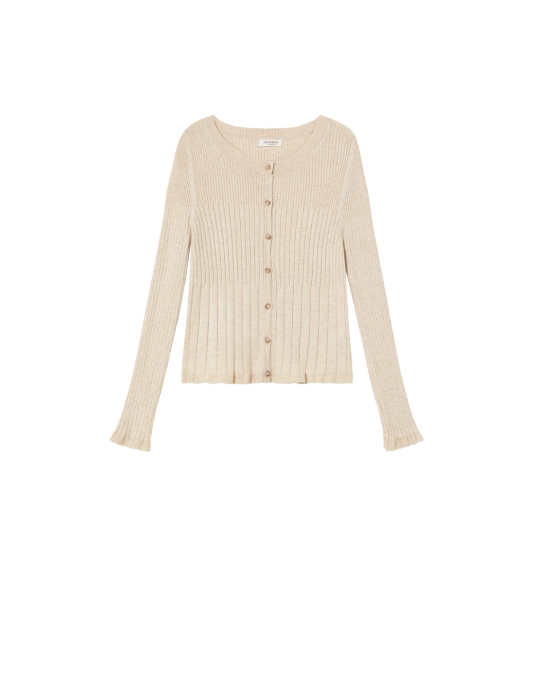 Long-sleeved, straight-cut cardigan with an unique design combining three different types of ribbing on the body and two on the sleeves. It has a round neck and a front button placket. The cuffs feature a three-button detail. It pairs perfectly with the Seef top for a two-piece design.