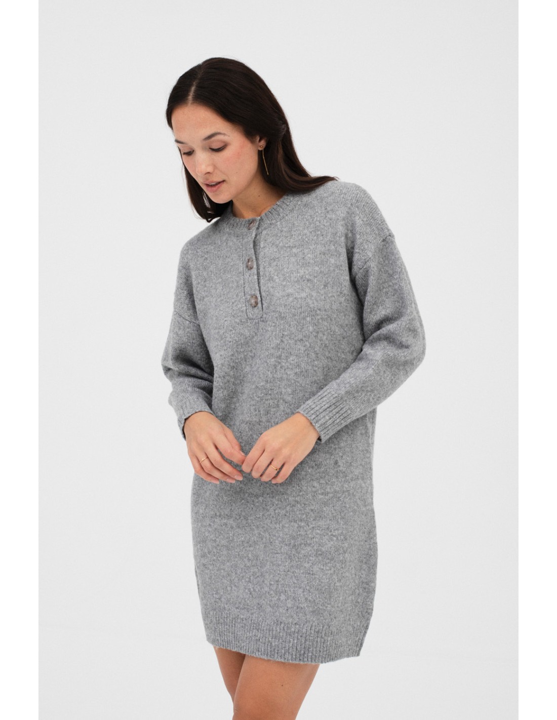 Short knitted dress with a ribbed trim and front button placket detail for a sophisticated and versatile style.