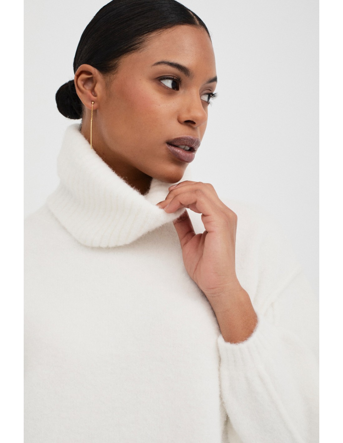 Long sleeved jumper that comes with a high neck complement. It is detailed with external stitching and ribbed trims, which gives it a modern and elegant style.